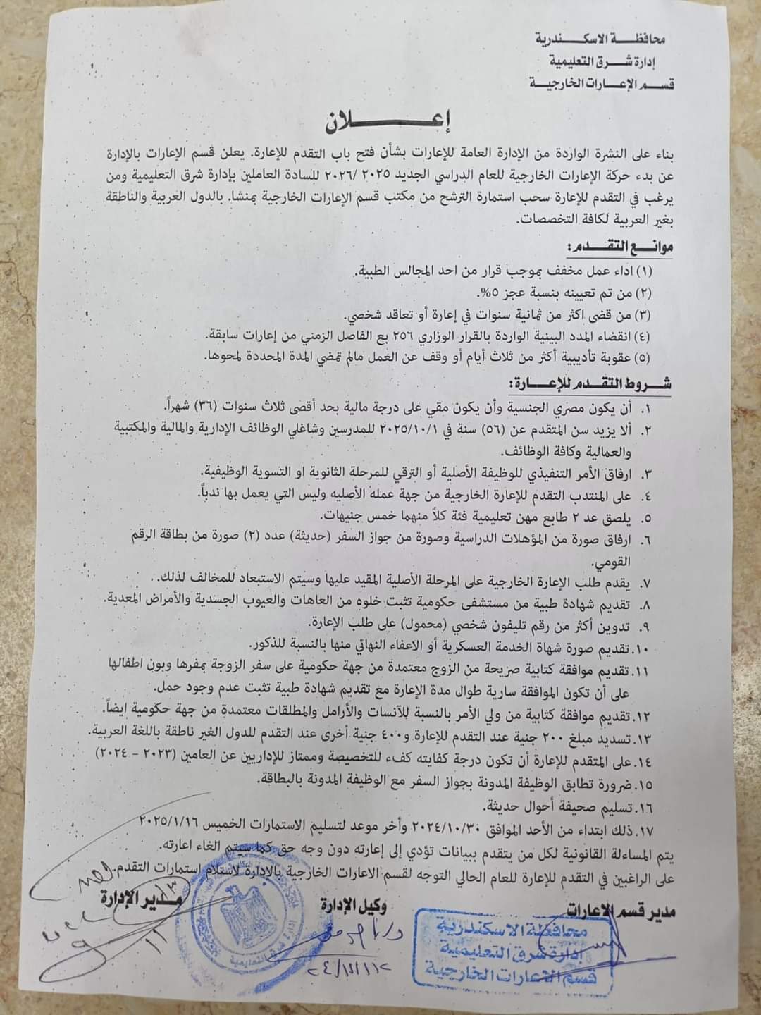 أعلنت وزارة التربية والتعليم والتعليم الفني، بدء حركة الإعارات الخارجية للعام الدراسي الجديد ۲۰۲۵/ ۲۰۲۶ لمن يرغب في التقدم للإعارة سحب استمارة الترشح من مكتب قسم الإعارات الخارجية بالدول العربية والناطقة بغير العربية لكافة التخصصات.