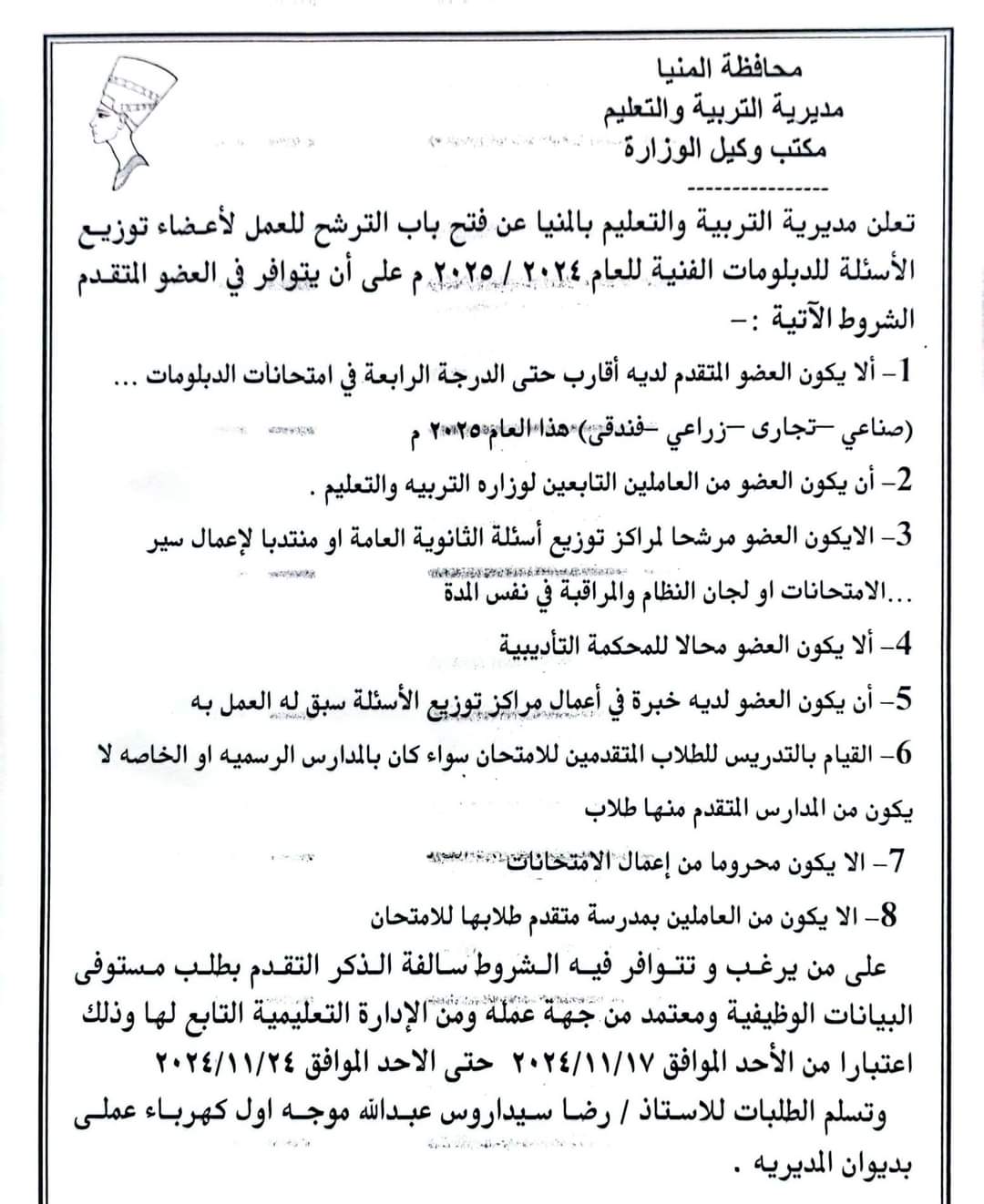 أعلنت مديرية التربية والتعليم بالمنيا، عن فتح باب الترشح للعمل لأعضاء توزيع الأسئلة للدبلومات الفنية للعام ٢٠٢٤ / ۲۰۲٥ م على أن يتوافر في العضو المتقدم الشروط الآتية:-