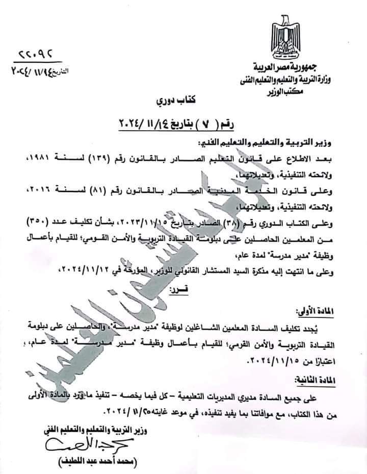 حيث تقرر تجديد تكليف المعلمين الشاغلين لوظيفة مدير مدرسة، والحاصلين على دبلومة القيادة التربوية والأمن القرمي للقيام بأعمال وظيفة مدير مدرسة لمدة عام اعتبارا من ٢٠٢٤/١١/١٥.