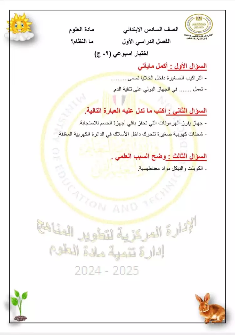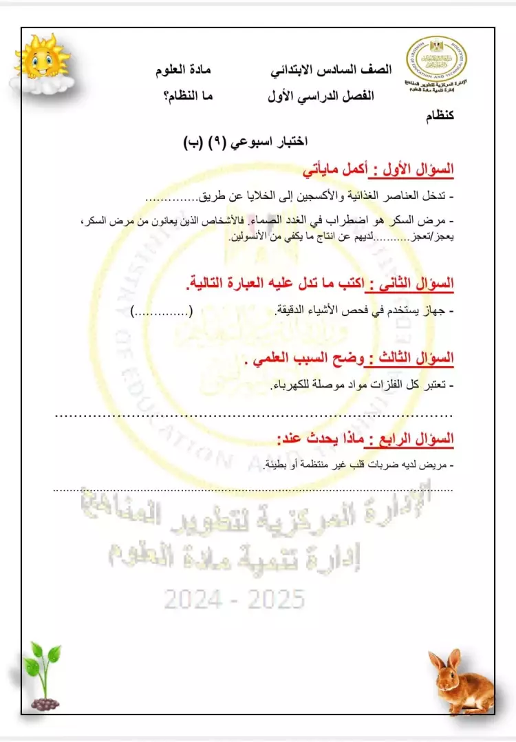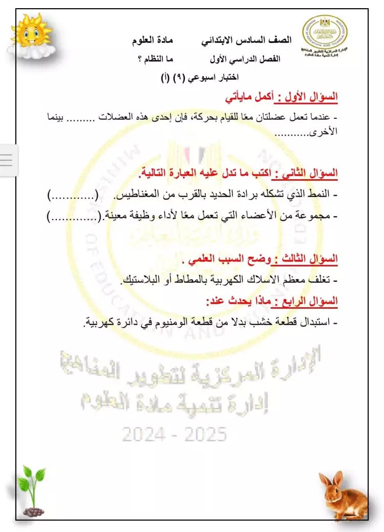 التقييم الأسبوعي علوم للصف السادس الابتدائي الأسبوع التاسع 2024