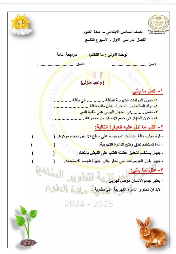 الواجب المنزلي والتقييم الأسبوعي والأداء الصفي علوم الصف السادس الابتدائي الأسبوع التاسع 2024