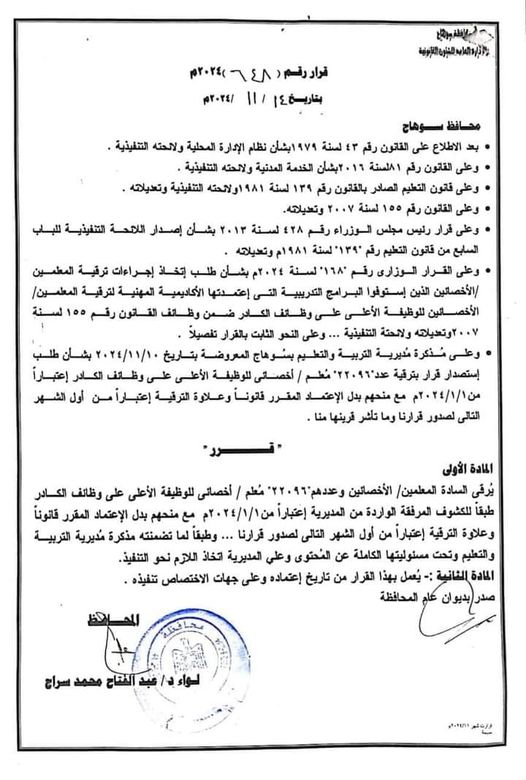 وافق اللواء عبدالفتاح محمد سراج محافظ سوهاج على مذكرة مديرية التربية والتعليم بسوهاج المعروضة بتاريخ ٢٠٢٤/١١/١٠، بشأن طلب استصدار قرار بترقية عدد ۲۲۰۹٦ معلم / أخصائي للوظيفة الأعلى على وظائف الكادر اعتبارًا من ٢٠٢٤/١١م، مع منحهم بدل الاعتماد المقرر قانونًا وعلاوة الترقية إعتبارًا من أول الشهر التالي الصدور القرار.