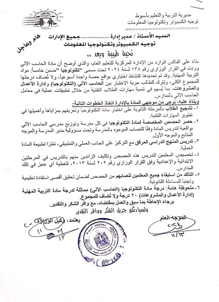 وذلك تنفيذا لما ورد بالقرار الوزاري رقم 138 لسنة 2024، تحت مسمى «التكنولوجيا»، ضمن مواد التربية المهنية.