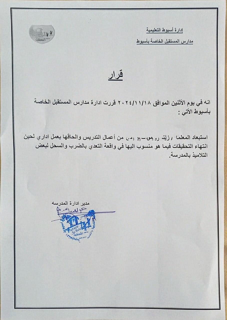 عاجل| ضربت وسحلت الطلاب.. استبعاد معلمة بأسيوط من التدريس للعمل الإداري (مستند)