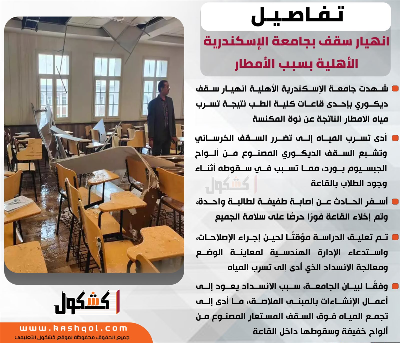 انفوجراف.. تفاصيل انهيار سقف بجامعة الإسكندرية الأهلية بسبب الأمطار