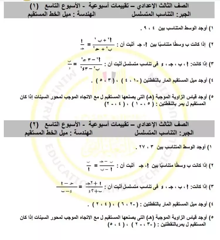 الواجب المنزلي والتقييم الأسبوعي والأداء الصفي الرياضيات للصف الثالث الإعدادي الأسبوع التاسع 2024