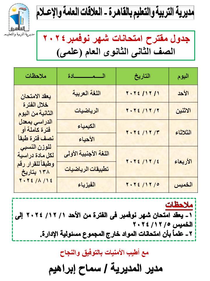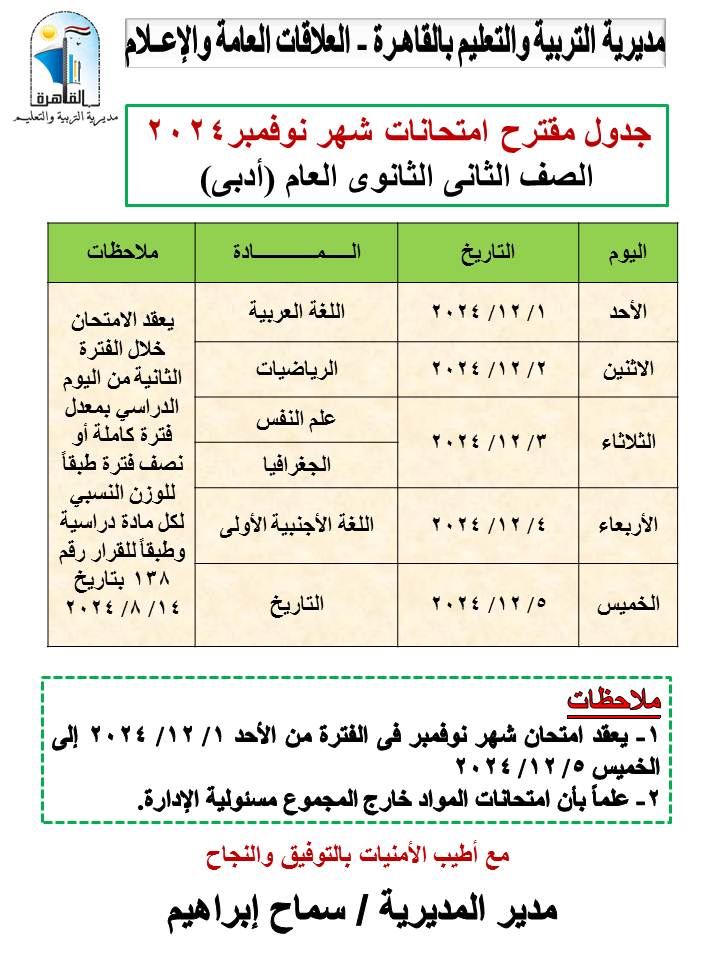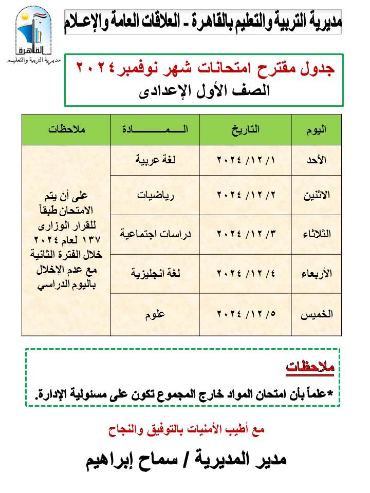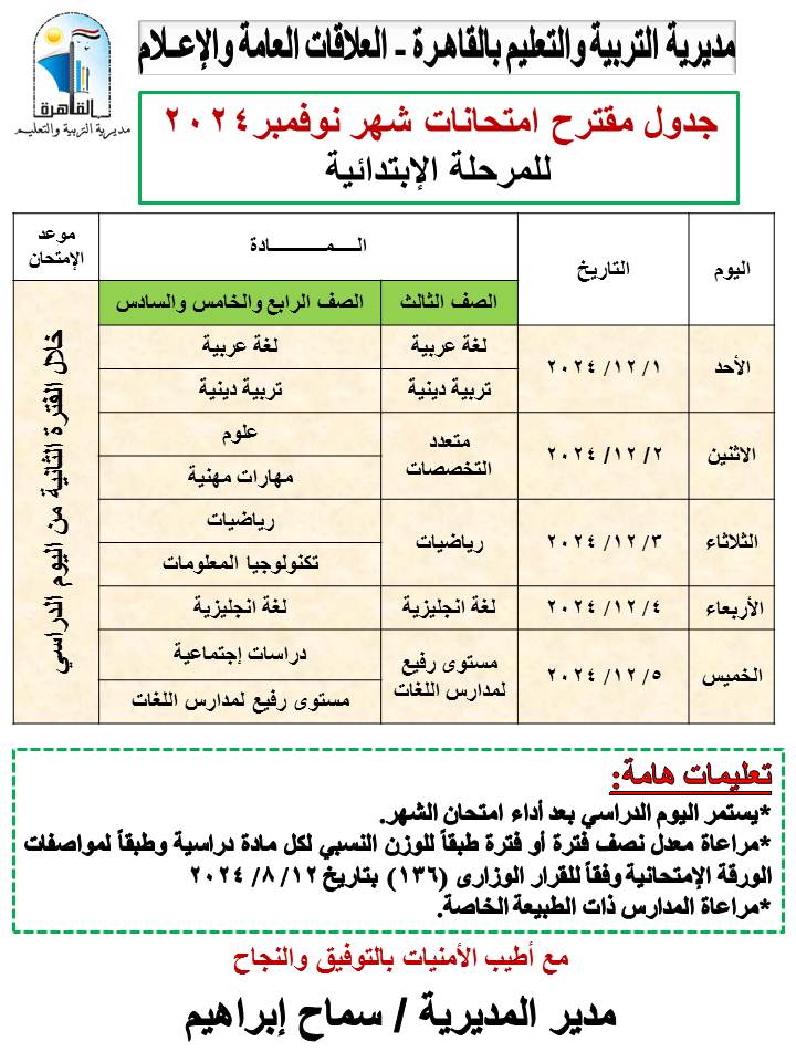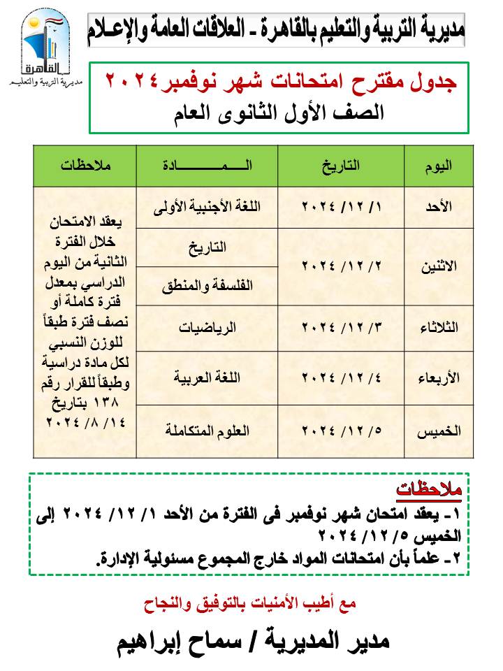 ويمكن الحصول على جداول امتحانات شهر نوفمبر 2024 لطلاب صفوف النقل بالقاهرة من مطالعة الصور التالية: