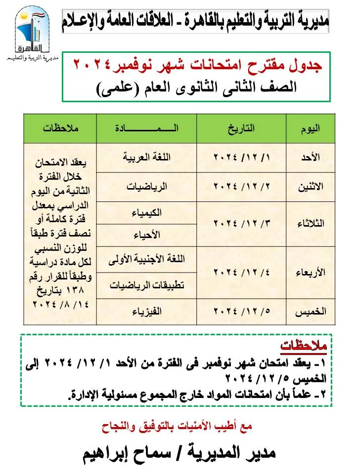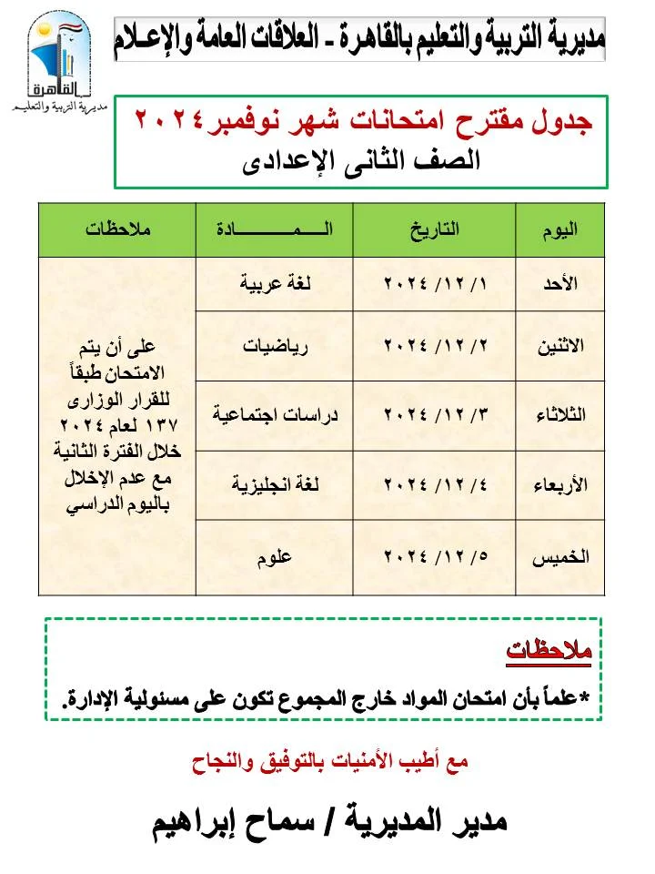 أعلنت مديرية التربية والتعليم بالقاهرة، مقترح جدول امتحانات شهر نوفمبر للعام الدراسي 2025/2024 على أن يبدأ من يوم الأحد الموافق 1/12/2024 حتى يوم الخميس الموافق 5/12/2024