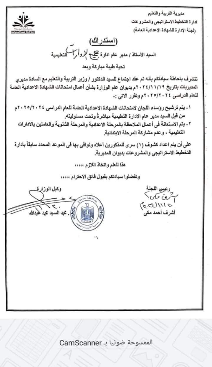 قررت وزارة التربية والتعليم والتعليم الفني، أن يتم ترشيح رؤساء اللجان لامتحانات الشهادة الإعدادية العامة للعام الدراسي ٢٠٢٥/٢٠٢٤م من قبل مدير عام الادارة التعليمية مباشرة وتحت مسئوليته.