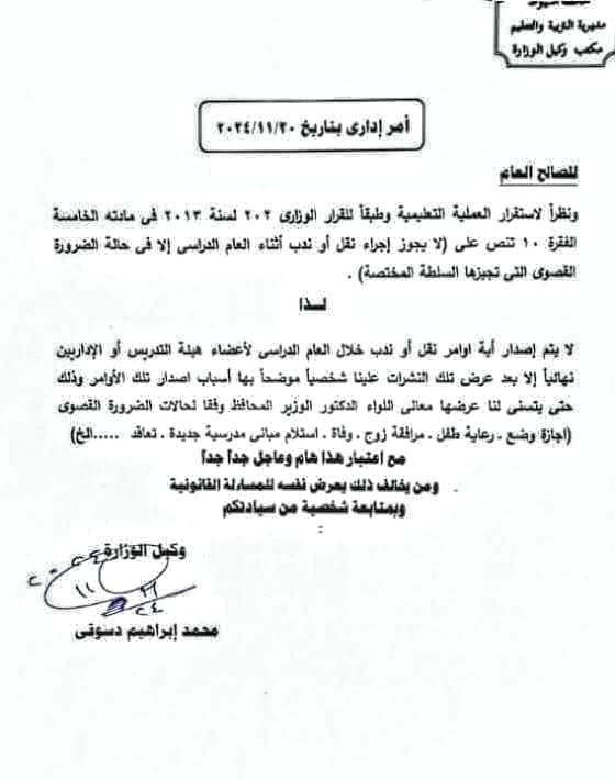 وشددت على ضرورة توضيح أسباب إصدار أوامر النقل أو الندب، حتى يتسنى عرضها على محافظ أسيوط، وفقا لحالات الضرورة القصوى (إجازة وضع، رعاية طفل، مرافقة زوج، وفاة، استلام مباني مدرسية جديدة، تعاقد.. إلخ).