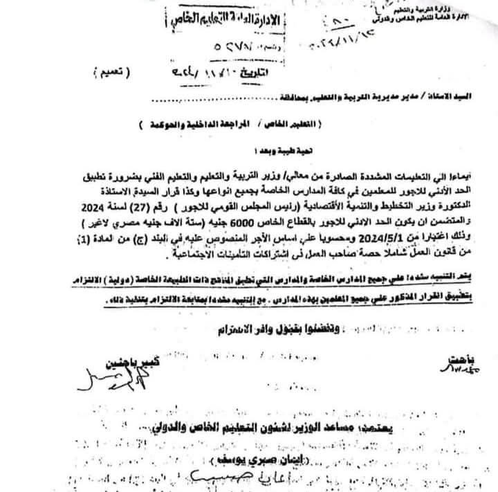 عاجل| 6000 جنيه.. ننشر خطاب تطبيق الحد الأدنى للأجور على معلمي المدارس الخاصة