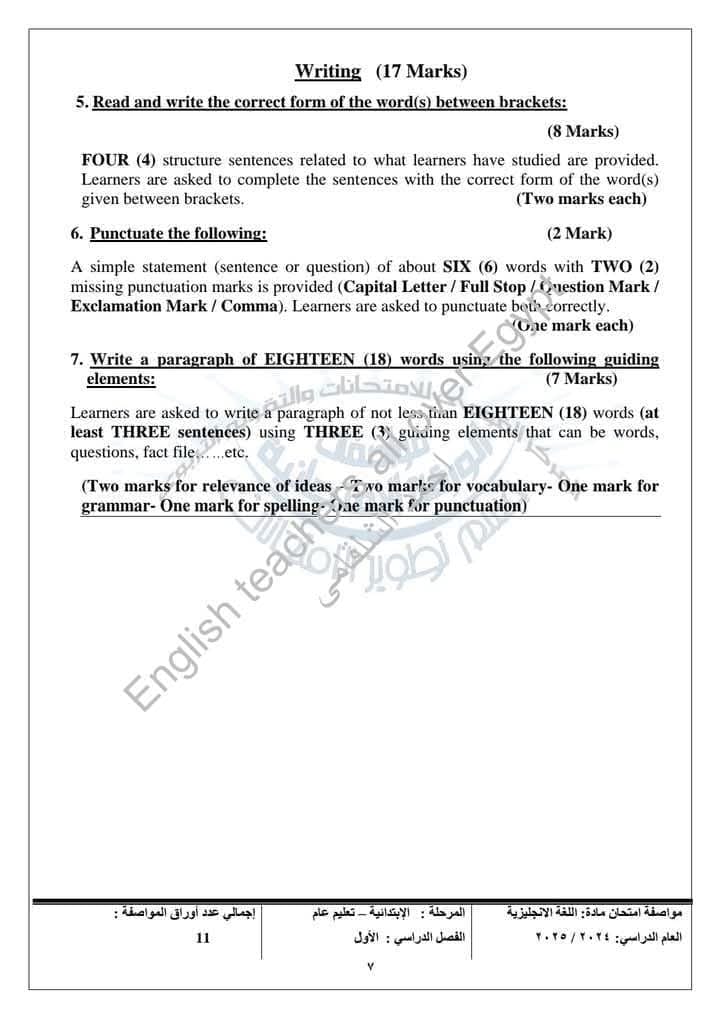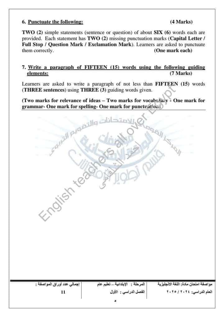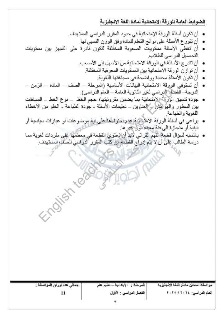 ضوابط الورقة الامتحانية لغة إنجليزية لطلاب الابتدائي بالترم الأول 2025