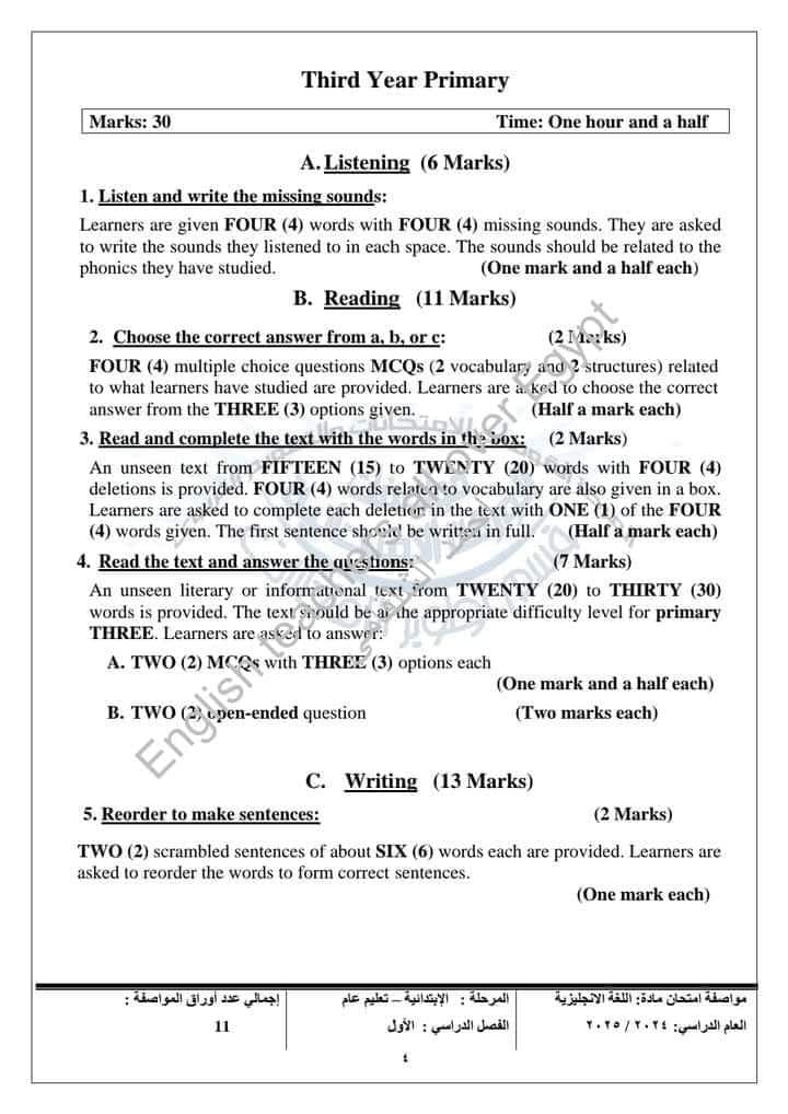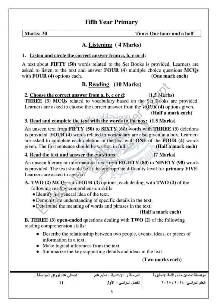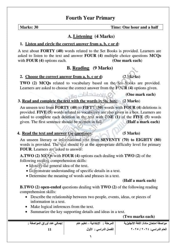 مواصفات امتحانات اللغة الإنجليزية لطلاب الابتدائي بالترم الأول 2025