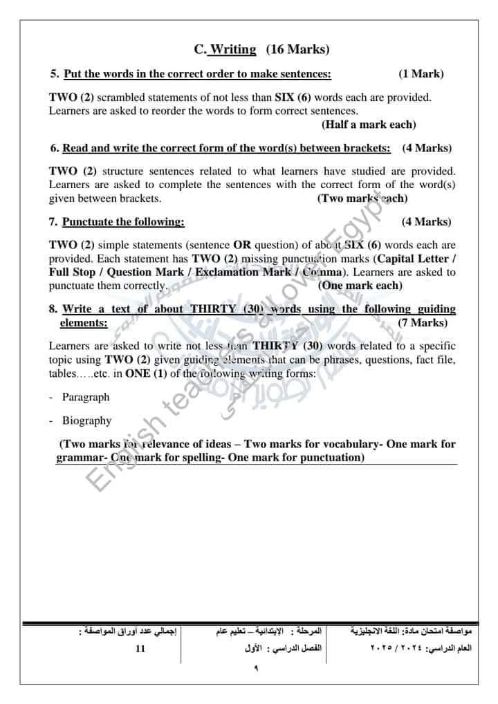 ضوابط ومواصفات الورقة الامتحانية لغة إنجليزية لطلاب الابتدائي بالترم الأول 2025