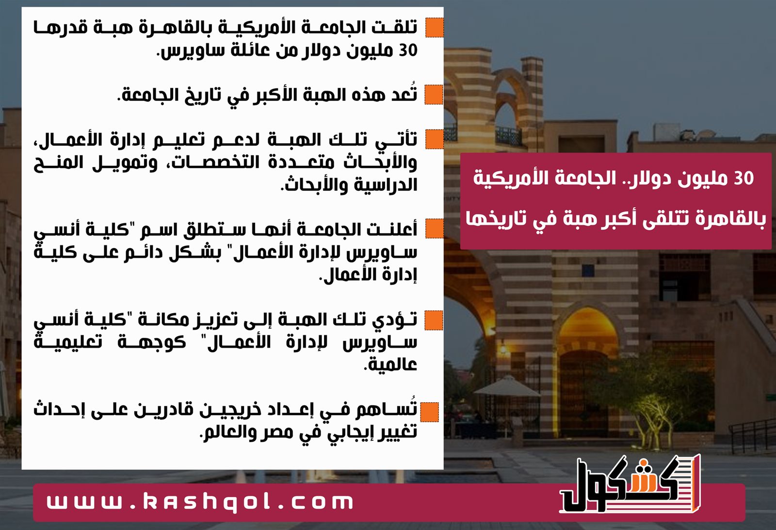 انفوجراف.. الجامعة الأمريكية تعلن تلقيها أكبر هبة في تاريخها من عائلة ساويرس