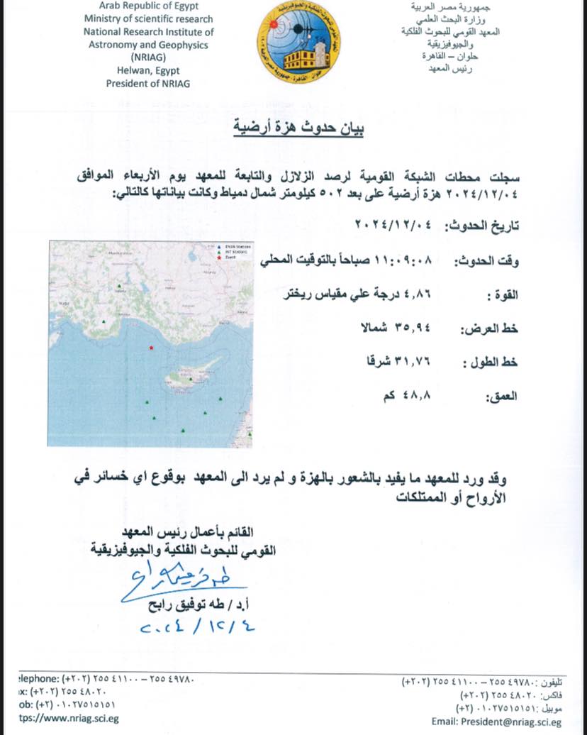 كشف الدكتور طه رابح، رئيس المعهد القومي للبحوث الفلكية، أن محطات الشبكة القومية لرصد الزلازل، والتابعة للمعهد، سجلت هزة أرضية بقوة 4.8 درجة على مقياس ريختر شمال غرب قبرص، على بعد 502 كم من دمياط.