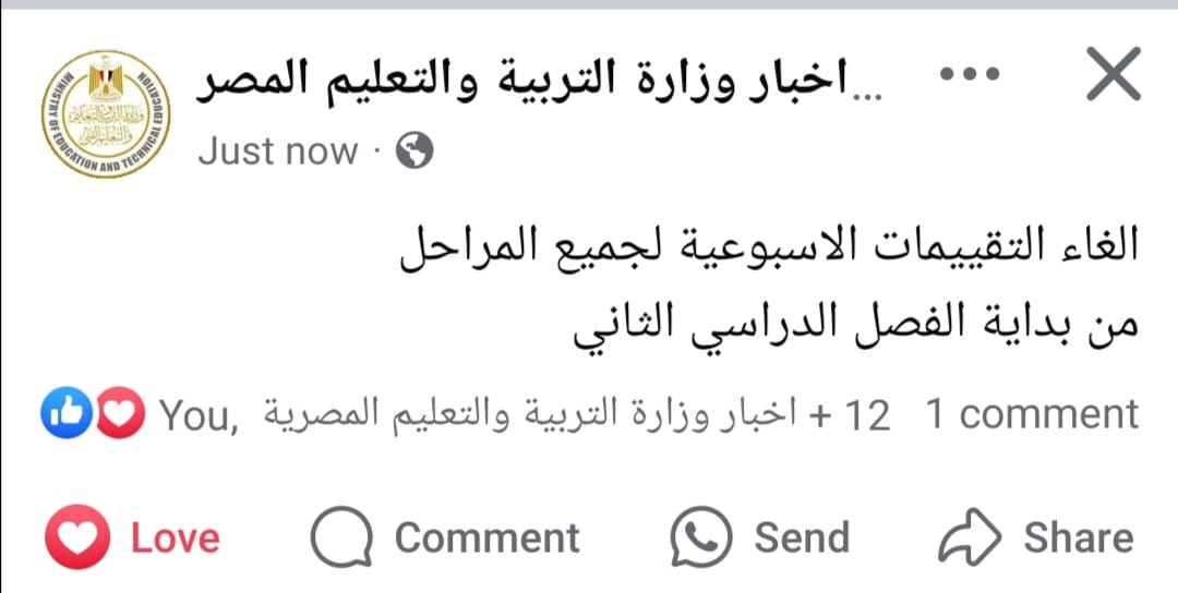 أثارت صفحة مزورة تحمل اسم "وزارة التربية والتعليم المصرية" على موقع فيسبوك حالة من الجدل بين أولياء الأمور. نشرت الصفحة منشورًا زعمت فيه أنه تم إلغاء التقييمات الأسبوعية في جميع المراحل التعليمية بدءًا من الفصل الدراسي الثاني.
