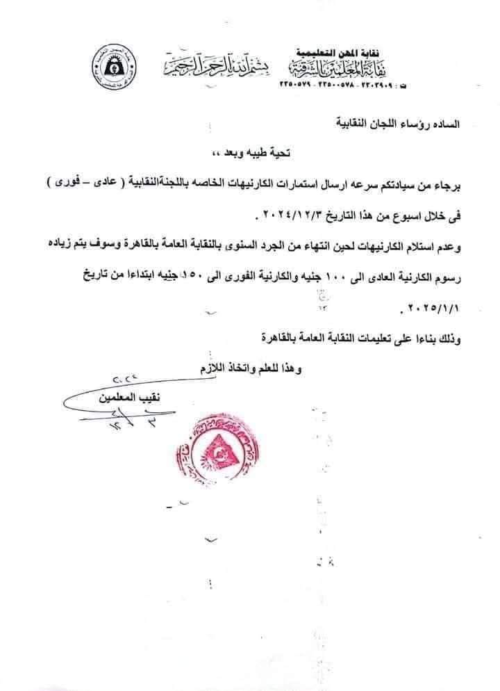ووجهت النقابة بسرعة إرسال استمارات الكارنيهات الخاصة باللجنة النقابية ( عادي - فوري ) في خلال أسبوع من هذا التاريخ ٢٠٢٤/١٢/٣.