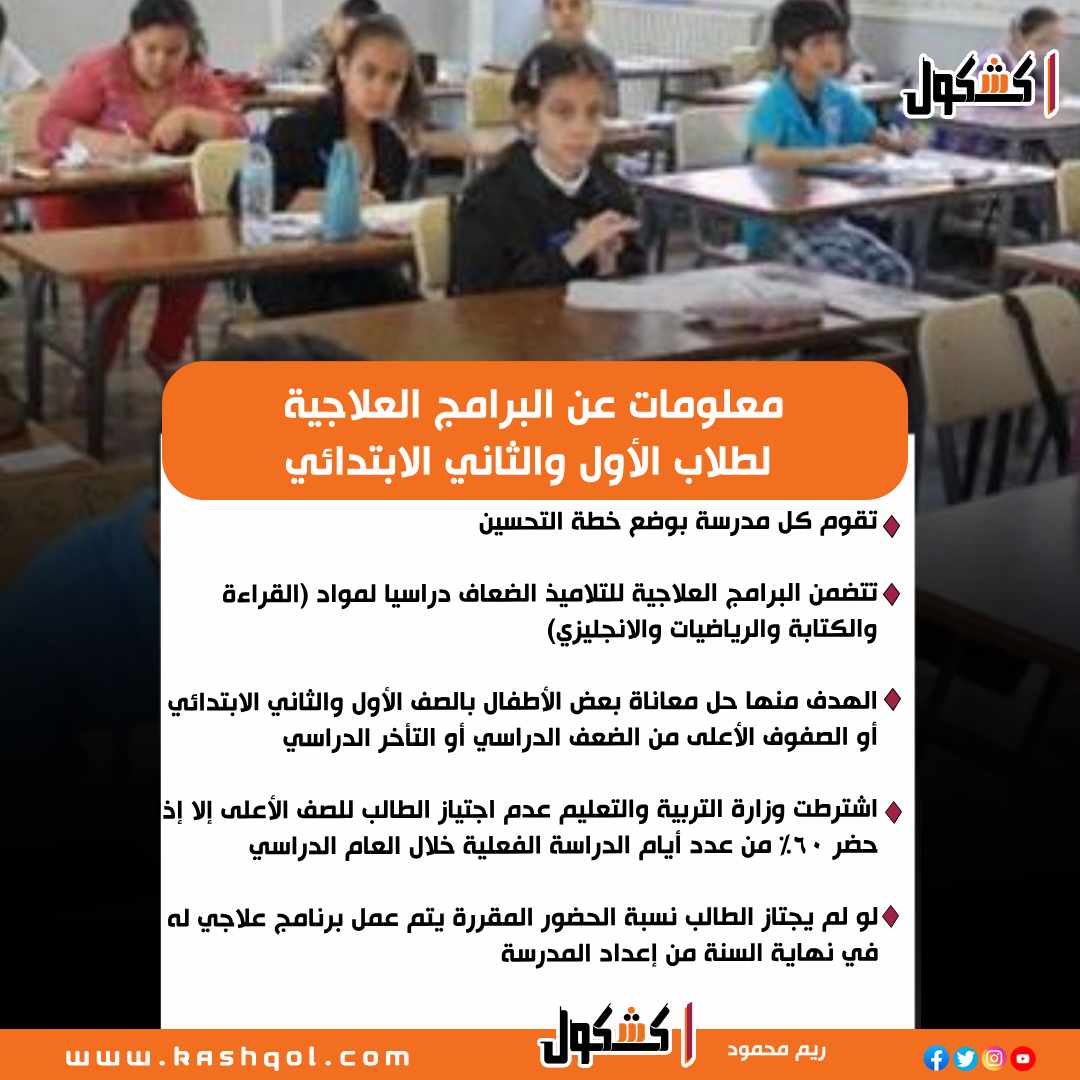 كشفت مصادر بوزارة التربية والتعليم والتعليم الفني، أن طالب الصف الأول أو الثاني الابتدائي الذي لا يجتاز التقييم يتم عمل برنامج علاجي له.