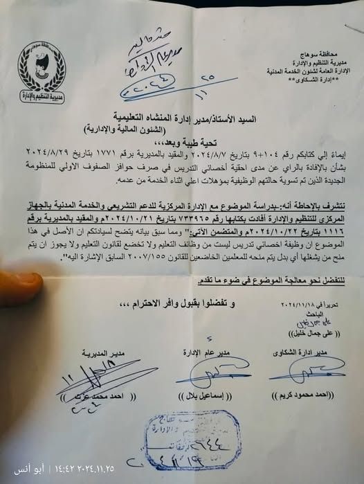 وعممت خطابا على المديريات التعليمية جاء نصه كالآتي: (إيماء إلى كتابكم رقم ۱۰٤ بتاريخ ۲۰۲٤/٨/٧ والمقيد بالمديرية برقم ۱۷۷۱ بتاريخ ٢٠٢٤/٨/٢٩ بشأن بالإفادة بالراي عن مدى احقية أخصائي التدريس في صرف حوافز الصفوف الأولي للمنظومة الجديدة الذين تم تسوية حالتهم الوظيفية بمؤهلات اعلي اثناء الخدمة من عدمه.