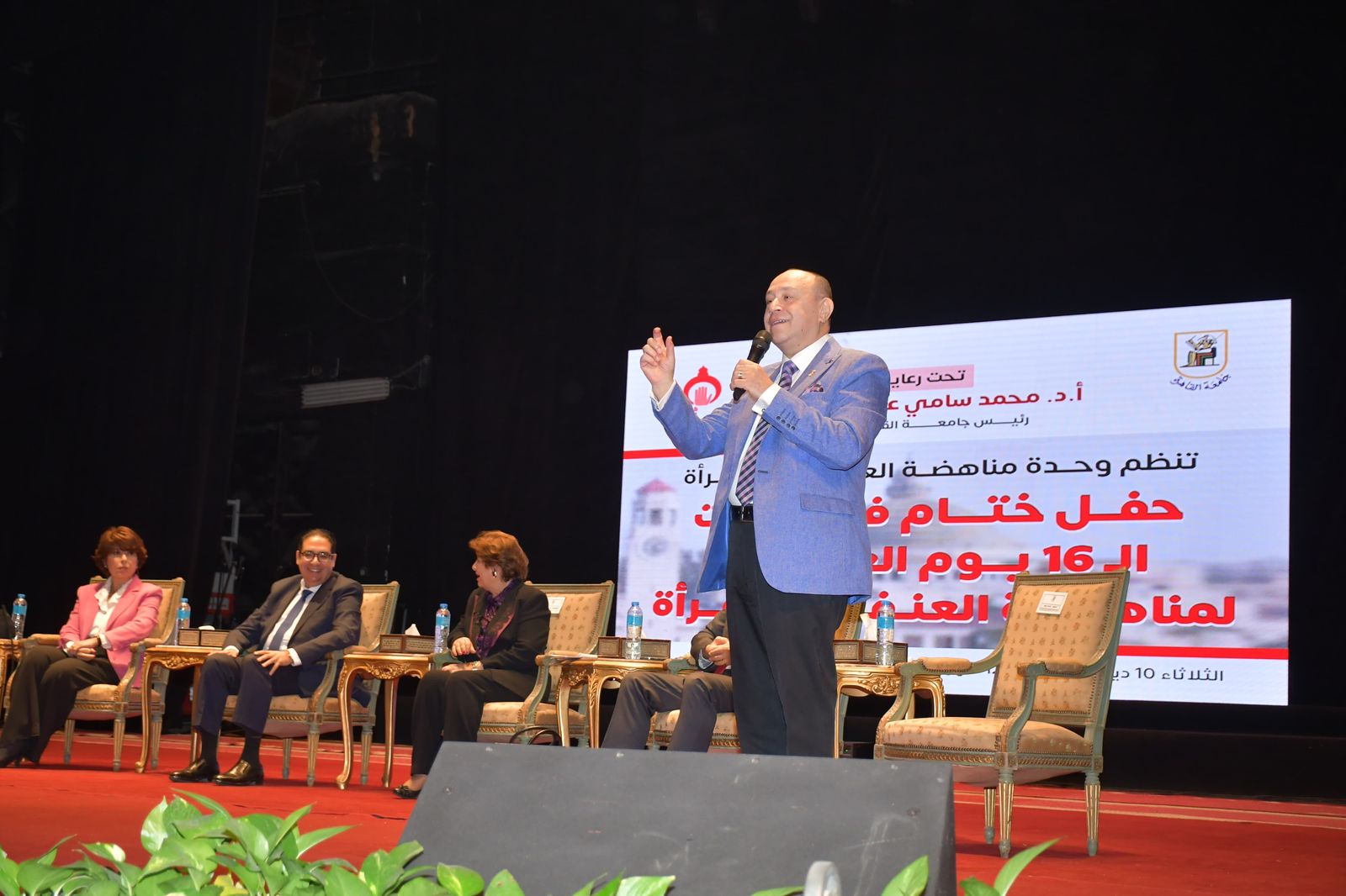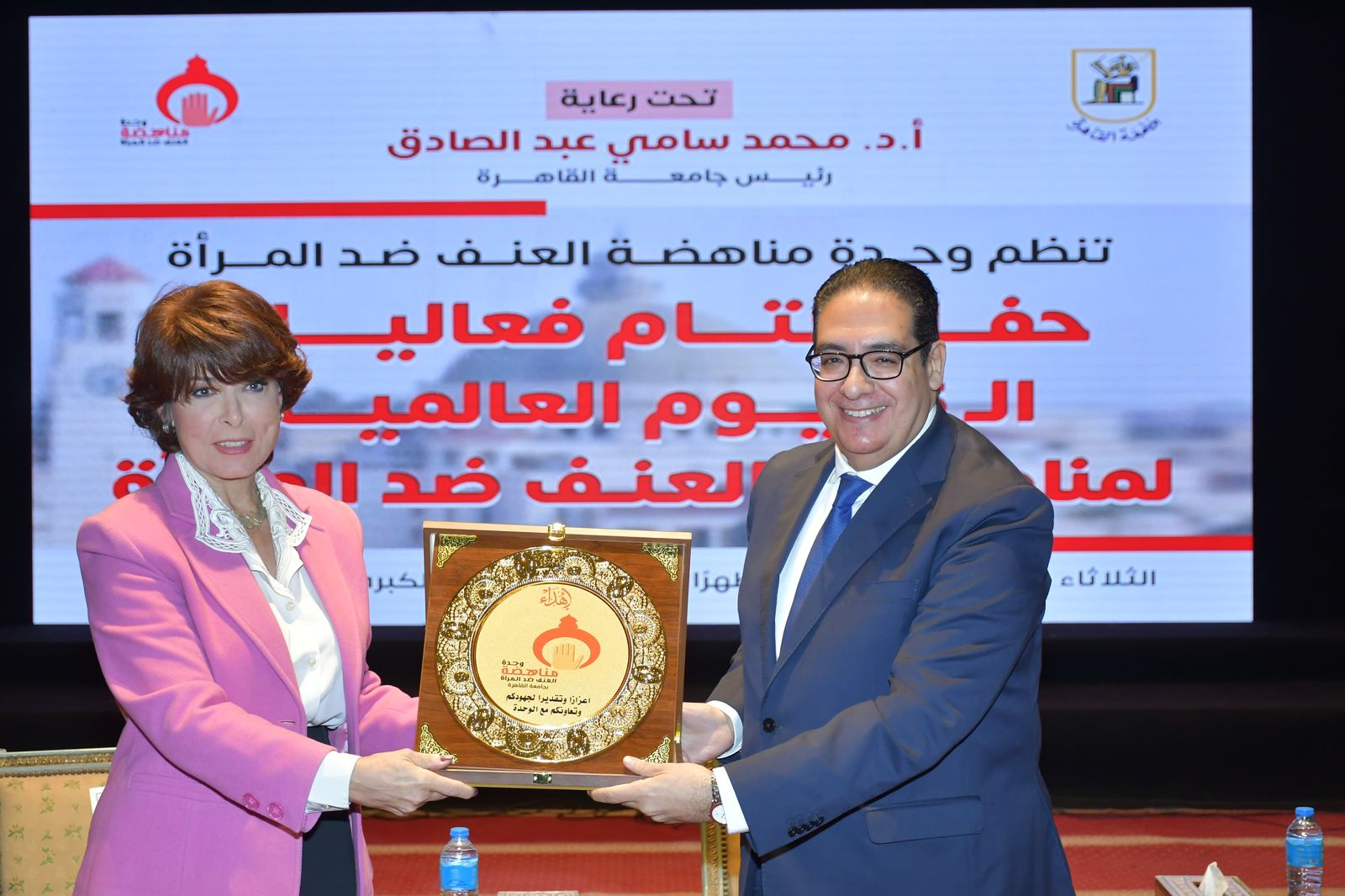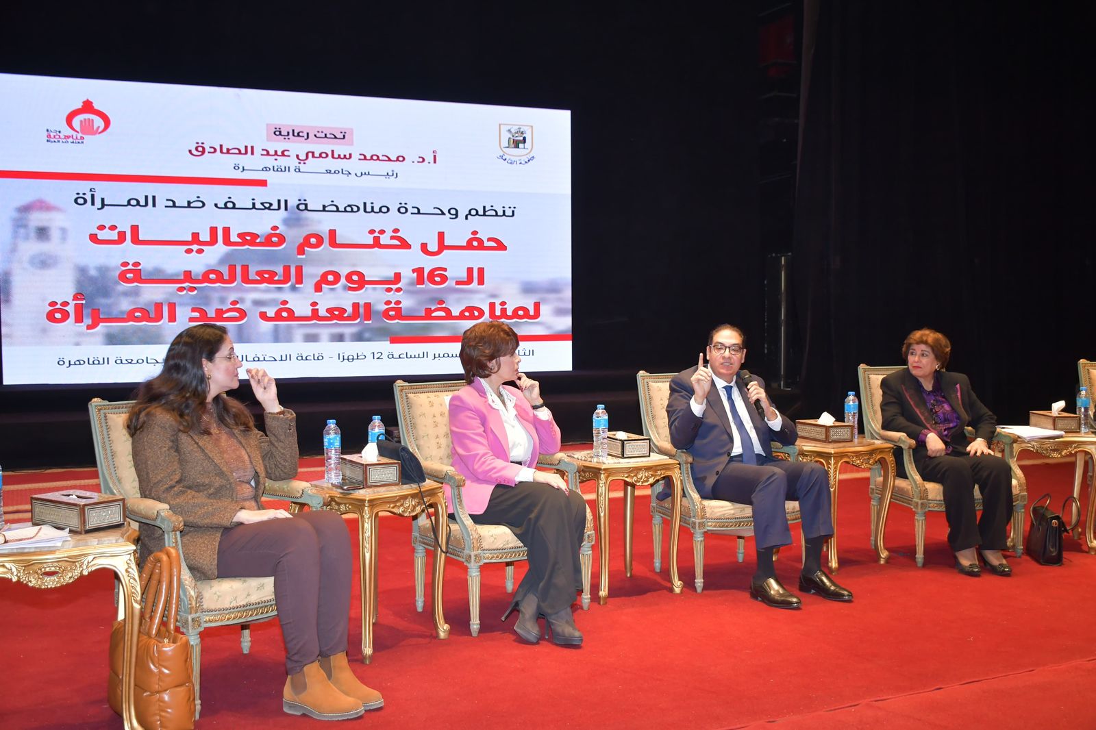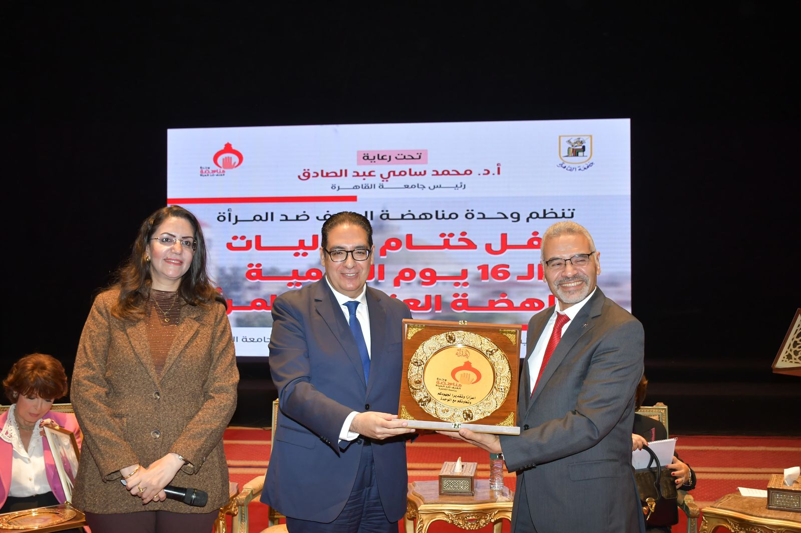 نظمت وحدة مناهضة العنف ضد المرأة بجامعة القاهرة، برعاية وحضور الدكتور محمد سامي عبد الصادق رئيس جامعة القاهرة، حفل ختام فعاليات حملة الـ 16 يوما العالمية لمناهضة العنف ضد المرأة، وحضور الدكتور أحمد رجب نائب رئيس جامعة القاهرة لشئون التعليم والطلاب، والدكتورة أميرة تاوضروس مدير وحدة مناهضة العنف ضد المرأة، والفنانة أنوشكا، والإعلامية فريدة الزمر، والدكتور أيمن جعفر زهري عضو المجلس القومي لحقوق الإنسان، والدكتور أسامة عشم المدرب الدولي والمحاضر بأكاديمية الشرطة، ولفيف من عمداء الكليات، وأعضاء هيئة التدريس والعاملين والطلاب.