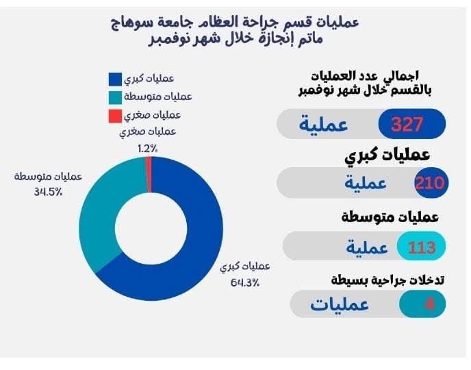 وأوضح الدكتور أحمد صالح رئيس قسم جراحة العظام بمستشفى جامعة سوهاج، أن الفريق الطبي بالقسم نجح خلال شهر نوفمبر في إجراء حوالي ٣٢٧ عملية جراحية منهم ٢١٠ عملية جراحية كبرى، و١١٣ عملية جراحية متوسطة، إلى جانب ٤ عمليات صغرى.