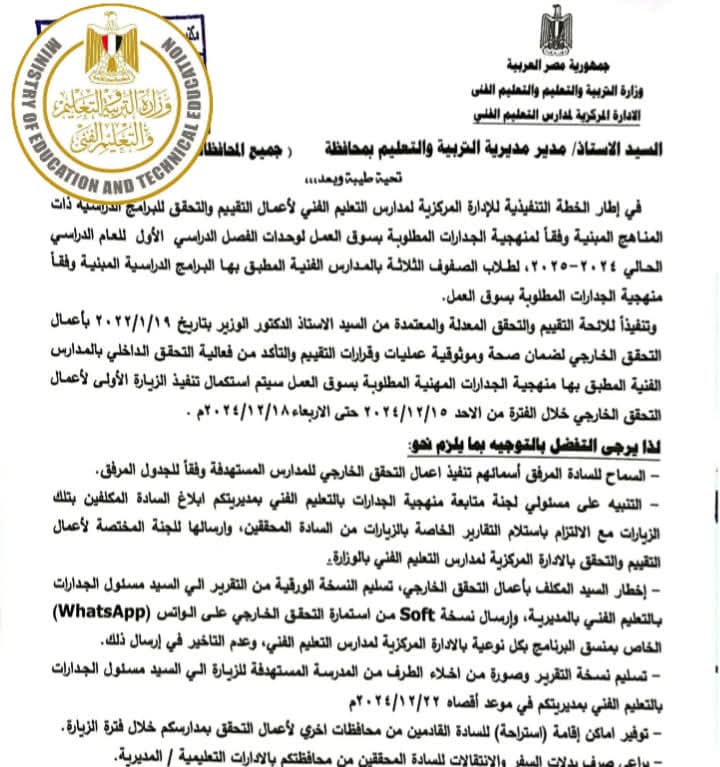 ووجهت وزارة التربية والتعليم والتعليم الفنى بتكليف المحققين بمهام التحقق الخارجي لأعمال التقييم بالمدارس الفنية المطبق بها منهجية الجدارات وفقًا لكل نوعية للعام الدراسي ٢٠٢٤ -٢٠٢٥م ولا يتم قبول أية اعتذارات إلا من خلال مدير المديرية، وذلك بخطاب موجه للدكتور رئيس الادارة المركزية لمدارس التعليم الفني.