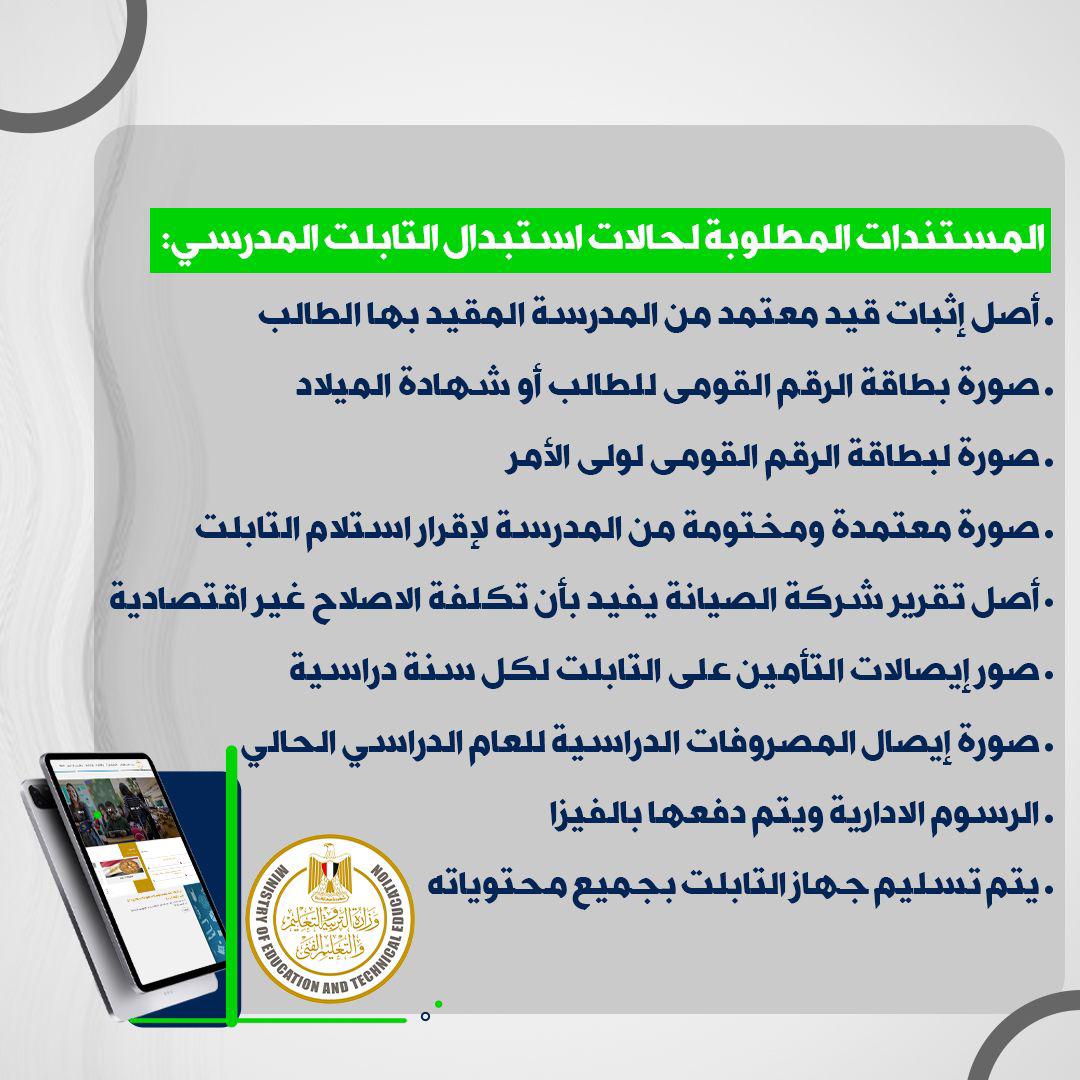 وتضمنت المستندات المطلوبة لحالات استبدال التابلت المدرسي لطلاب الأول الثانوي الآتي: