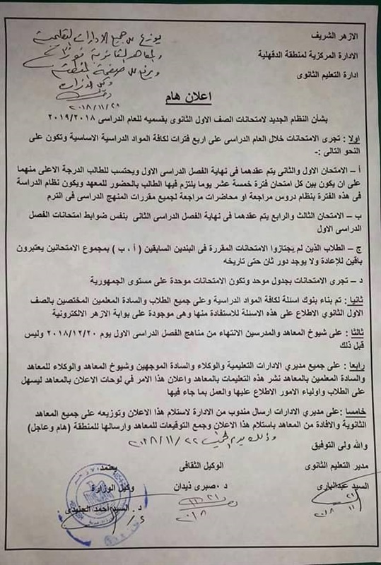 ونص قرار الأزهر، على أن تكون امتحانات الصف الأول الثانوي للعام الجاري، تجريبية ولا تضاف للمجموع.