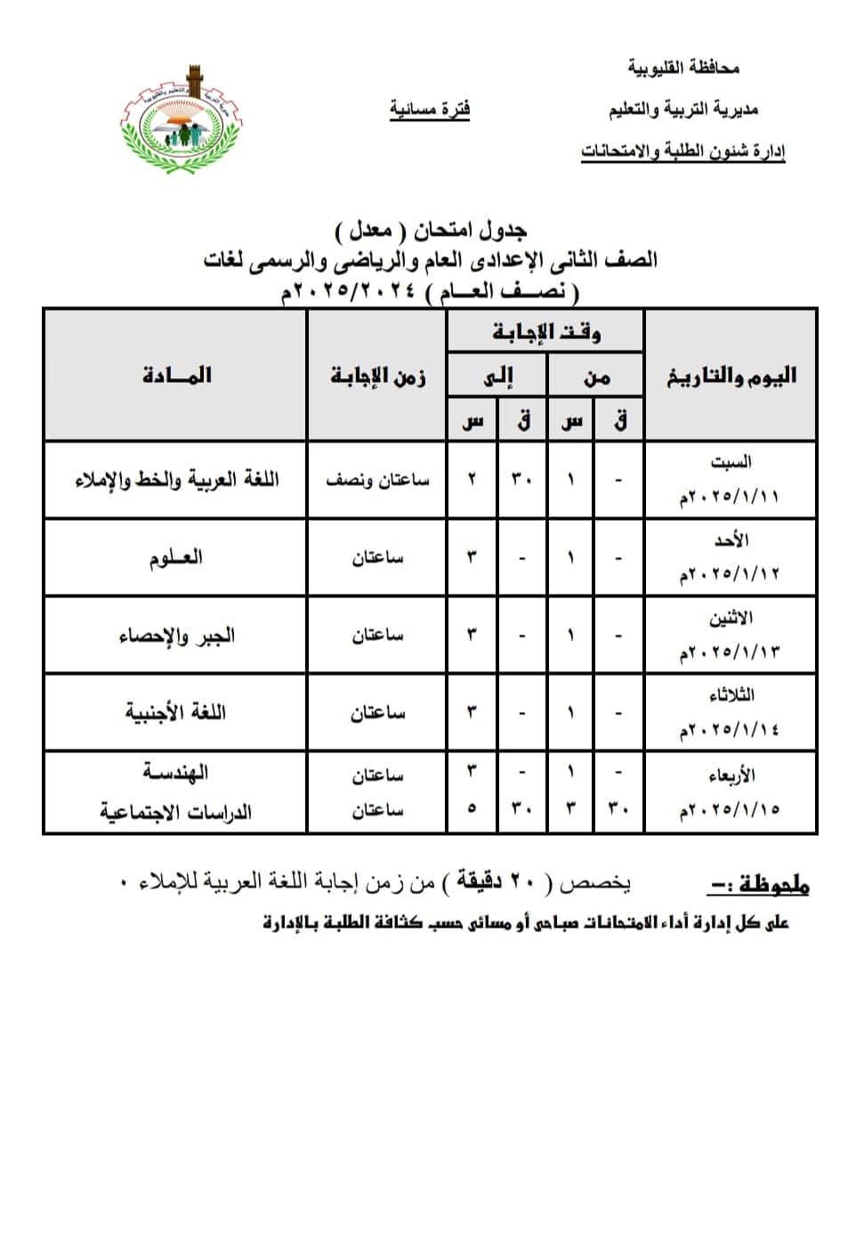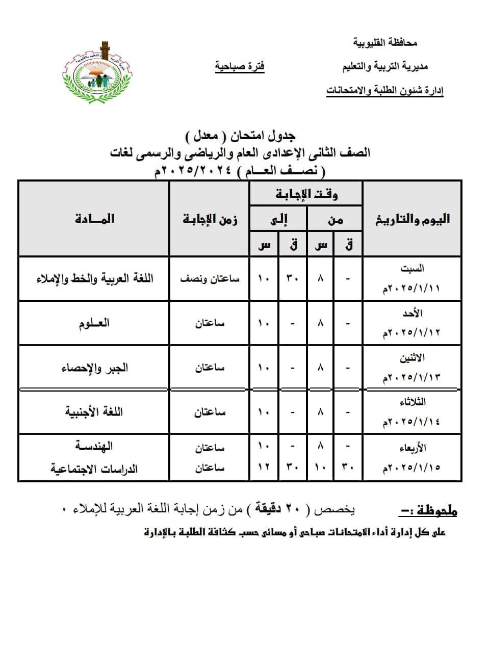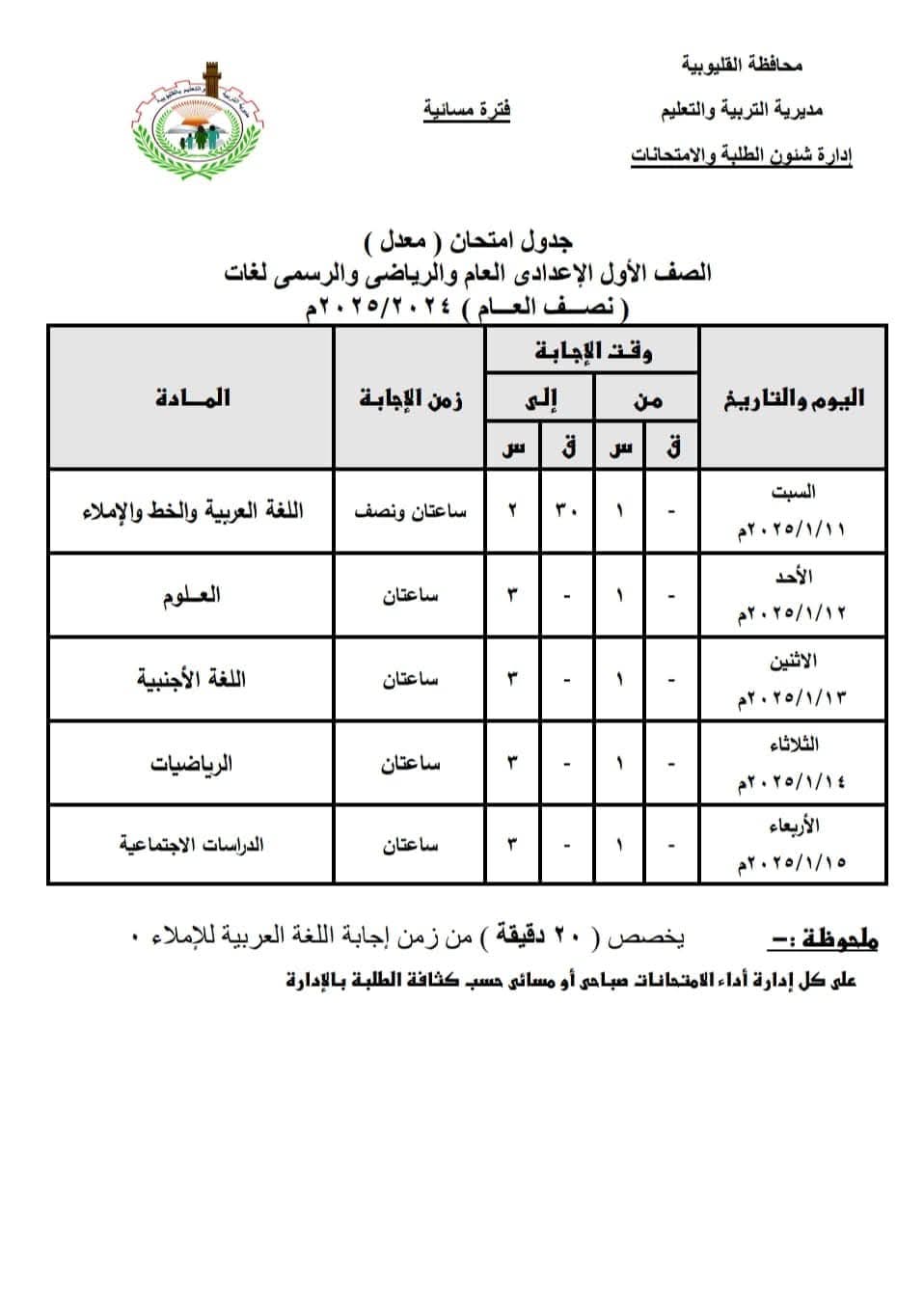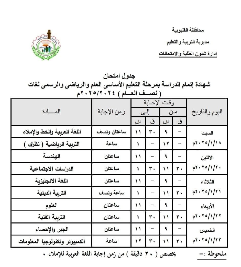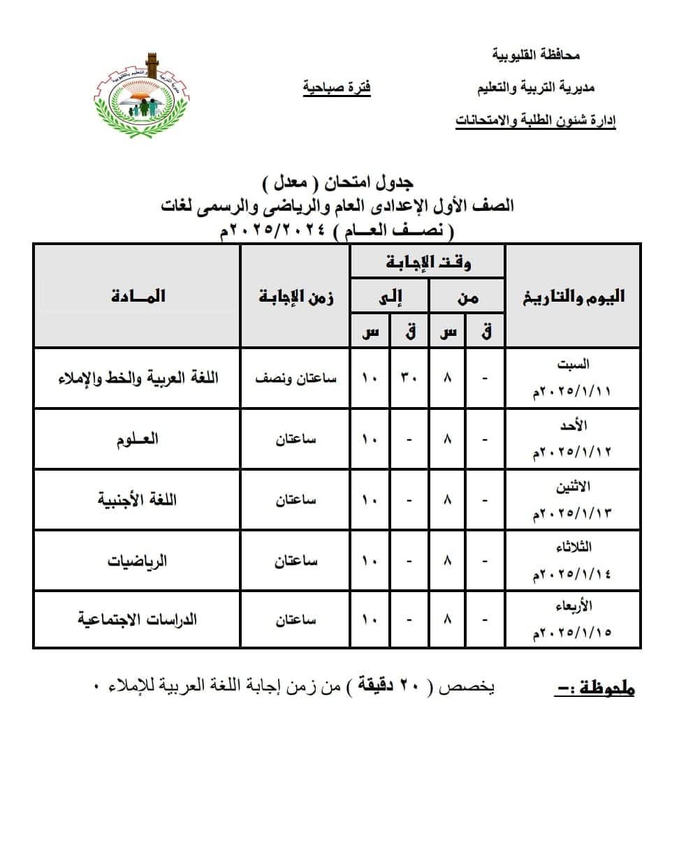 امتحانات الفصل الدراسي الأول للنقل والشهادة الإعدادية 2025 بالقليوبية