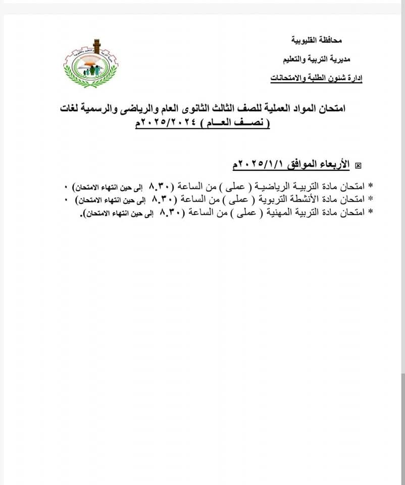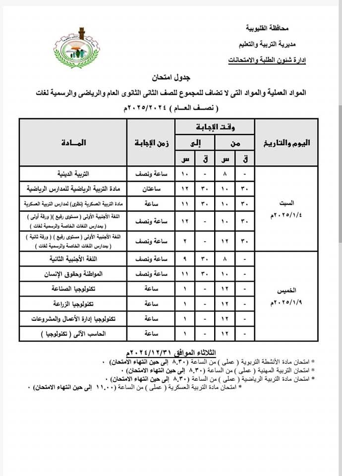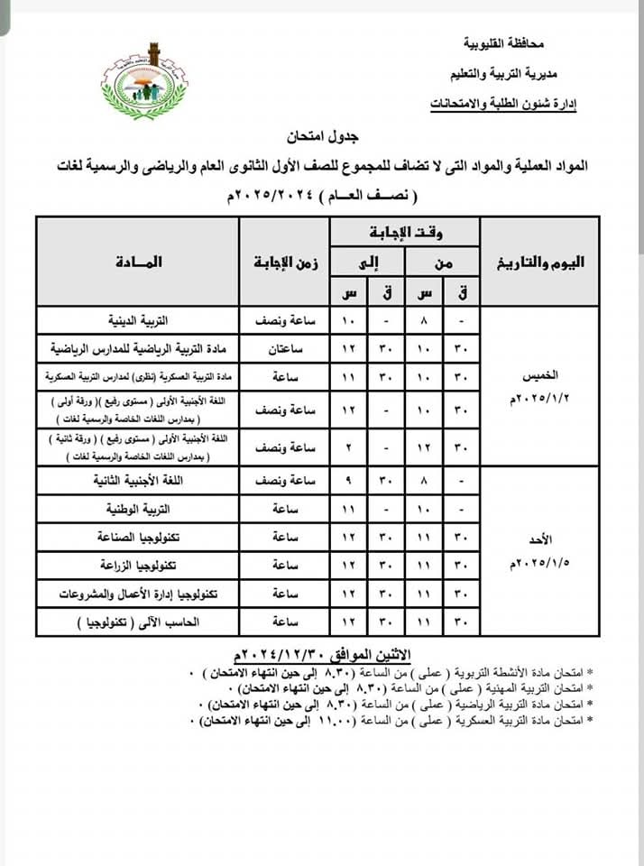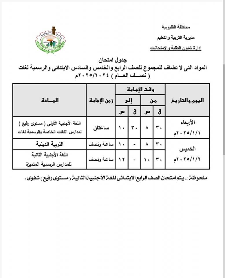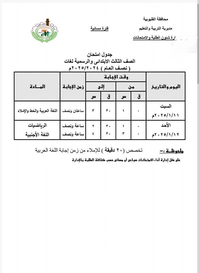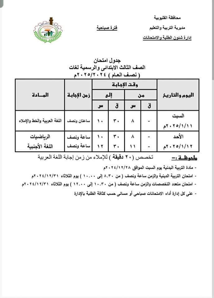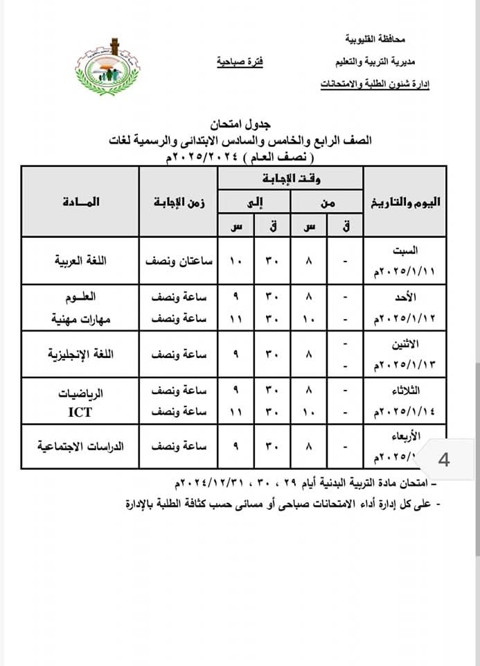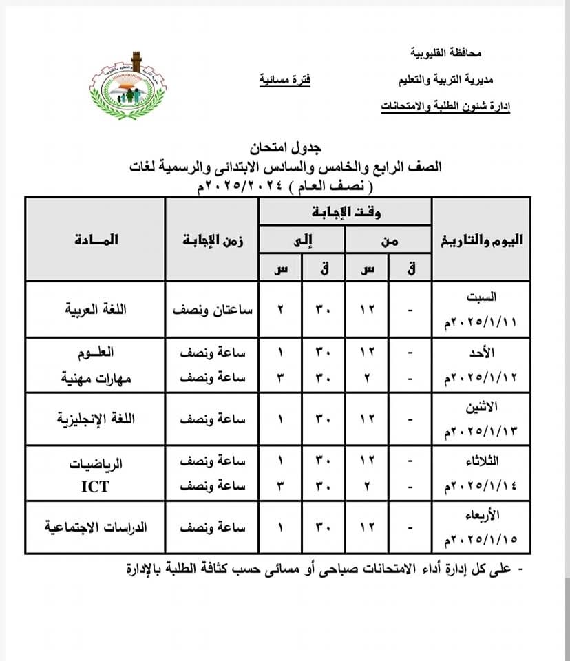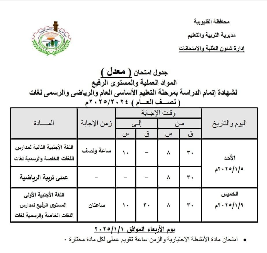امتحانات الفصل الدراسي الأول للنقل والشهادة الإعدادية 2025 بالقليوبية