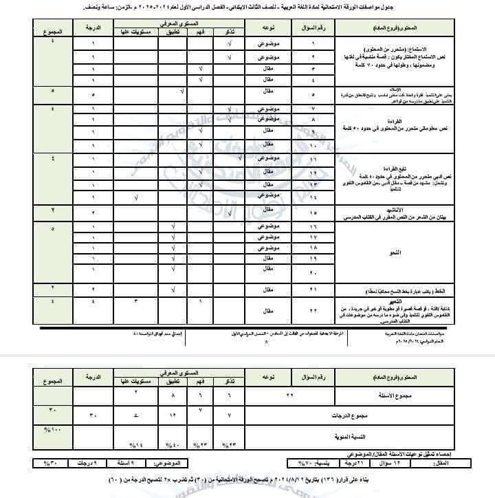 وأشارت وزارة التربية والتعليم، إلى أن عدد الأسئلة المقالية 12 سؤال بـ21 درجة بنسبة 70 %، بينما الأسئلة الموضوعية فتشمل 9 أسئلة بـ 9 درجات بنسبة 30%.