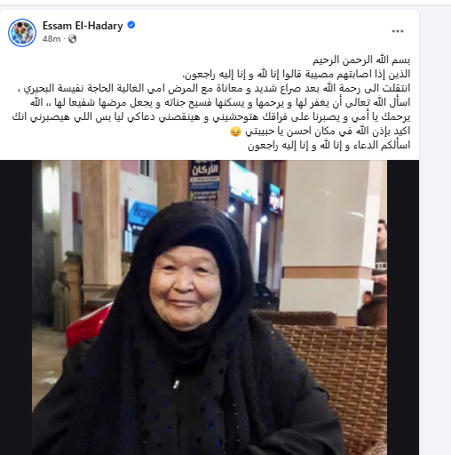 نشر عصام الحضري عبر حسابه الرسمي على موقع التواصل الإجتماعي «فيس بوك»: «انتقلت إلى رحمة الله بعد صراع شديد ومعاناة مع المرض أمي الغالية الحاجة نفيسة البحيري، أسأل الله تعالى أن يغفر لها ويرحمها ويسكنها فسيح جناته ويجعل مرضك شفيعا لها، الله يرحمك ياأمى ويصبرنا على فراقك هتوحشيني وينقصني دعاكي ليا بس اللي مصبرني انك اكيد بإذن الله في مكان احسن يا حبيبتي، اسألكم الدعاء وإنا لله وإنا إليه راجعون».