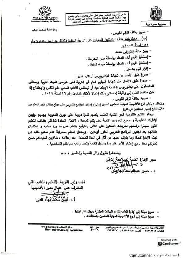 وقالت الأكاديمية المهنية للمعلمين، في خطابها، إنه في إطار سعي الأكاديمية المهنية للمعلمين على استيلاء شاغلي وظائف التعليم، شروط الحصول على شهادة الصلاحية اللازمة للنقل -التسكين- إلى وظائف المعلمين أو ما يقابلها المنصوص عليها في المادة 71 من قانون التعليم الصادر بالقانون رقم 139 لسنة 1981 والمضافة بالقانون رقم 100 لسنة 2007 ولائحته التنفيذية، وبناء على موافقة السلطة المختصة على عقد برنامج التسكين على الكادر أونلاين باعتباره برنامج التنمية المهنية اللازم للحصول على شهادة الصلاحية المشار إليها بعالية يرجى من التكرم بالتعاون في تنفيذ الآتي: