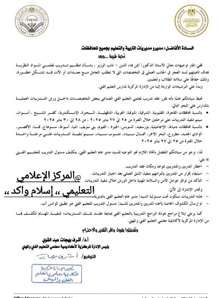 وتجدر الإشارة إلى أن التدريبات ستكون تحت مسئولية مدير عام التعليم الفني في كل مديرية، وسيتم إرسال الكشوف الخاصة بالمدربين والمتدربين عبر تطبيق واتس آب لمسئول التدريب. كما تم توجيه مراجعي جودة البرامج التدريبية للتعليم الفني بمتابعة تنفيذ هذه التدريبات وفقًا للمهام المكلفين بها من قبل الإدارة المركزية لأكاديمية معلمي التعليم الفني والمهني.