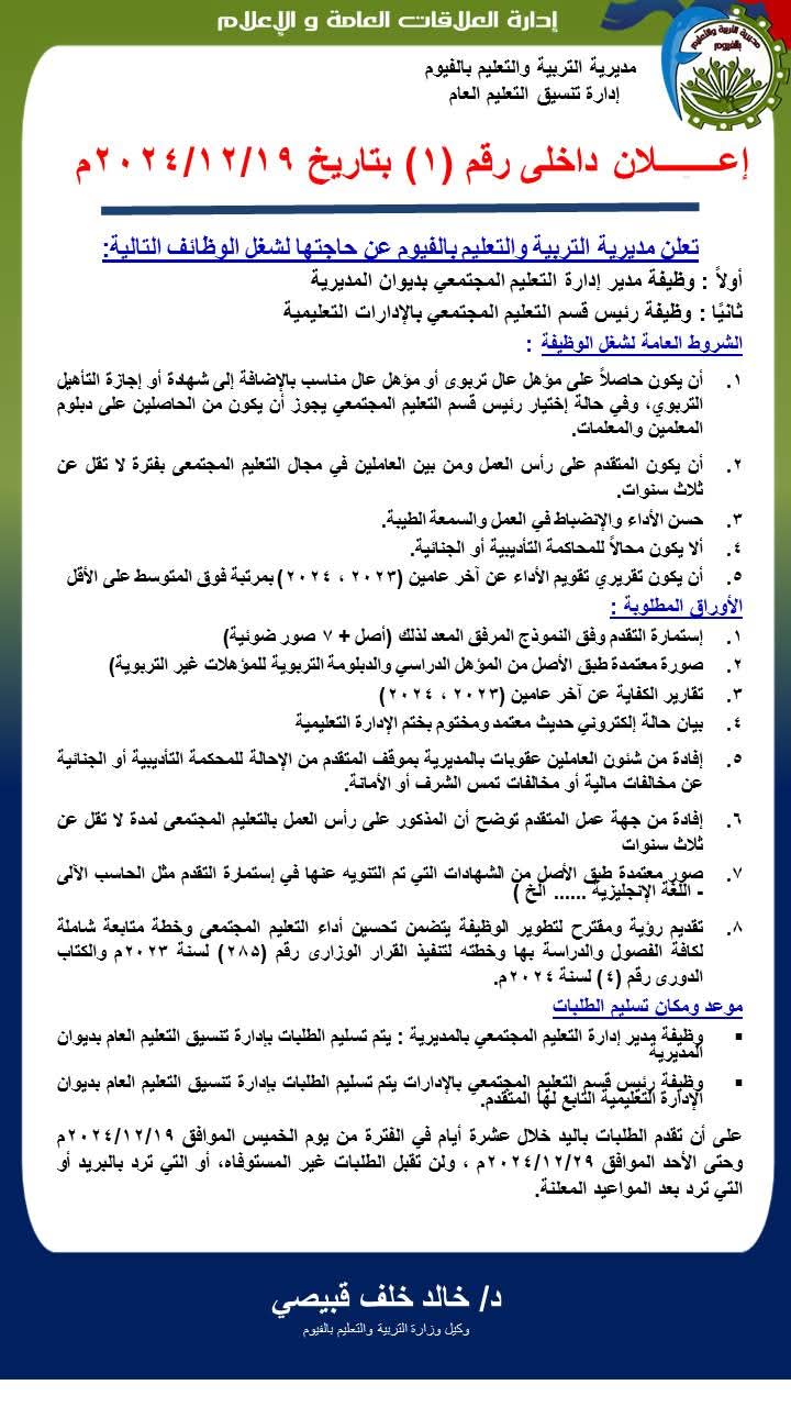 أعلنت مديرية التربية والتعليم بالفيوم عن حاجتها لشغل الوظائف التالية:( وظيفة مدير إدارة التعليم المجتمعي بديوان المديرية، وظيفة رئيس قسم التعليم المجتمعي بالإدارات التعليمية).