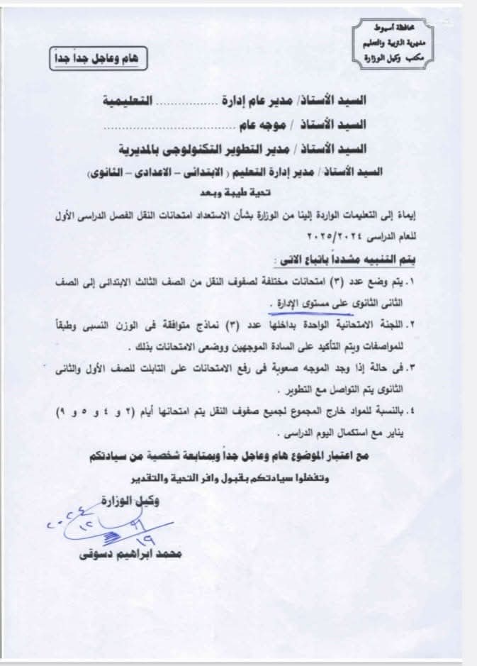 وشددت مديرية التربية والتعليم بأسيوط، على ضرورة التنبيه بتنفيذ الآتي: