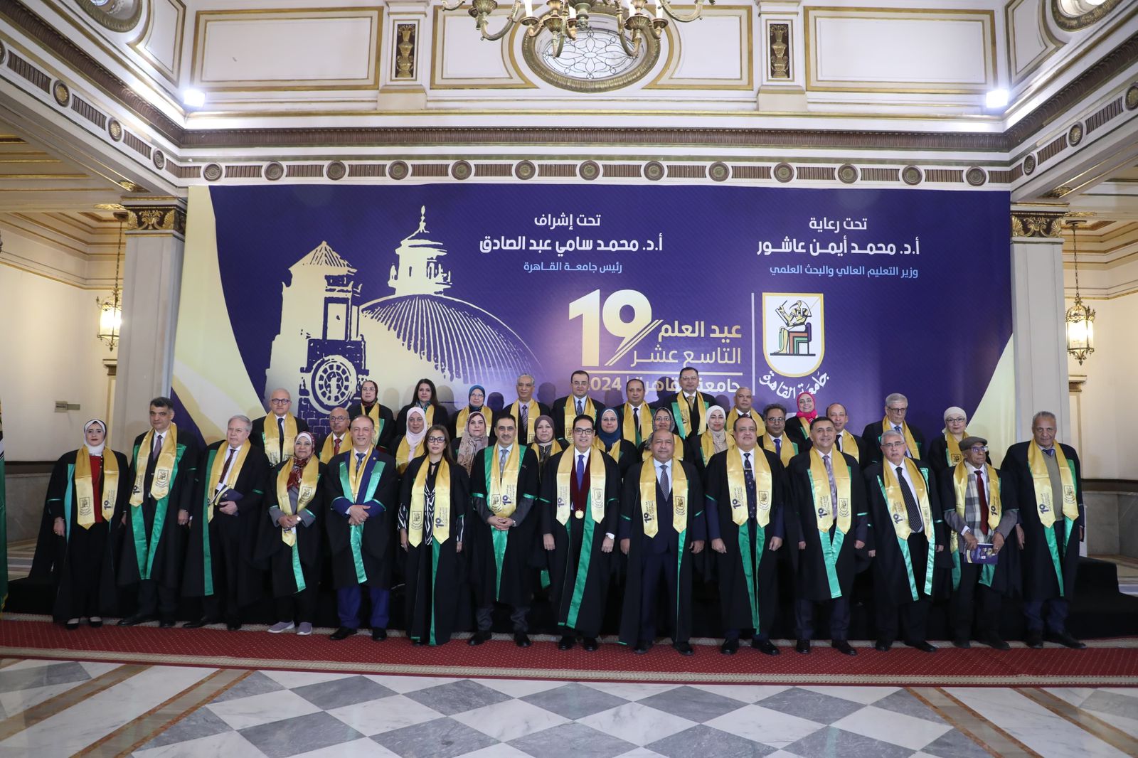 نظمت جامعة القاهرة تحت رعاية الدكتور محمد أيمن عاشور وزير التعليم العالي والبحث العلمي وإشراف الدكتور محمد سامي عبد الصادق، احتفالية عيد العلم التاسع عشر بقاعة الاحتفالات الكبرى، لتكريم ٦٣ عالما من علمائها الحاصلين على جوائز الدولة والجامعة عن عام 2023.