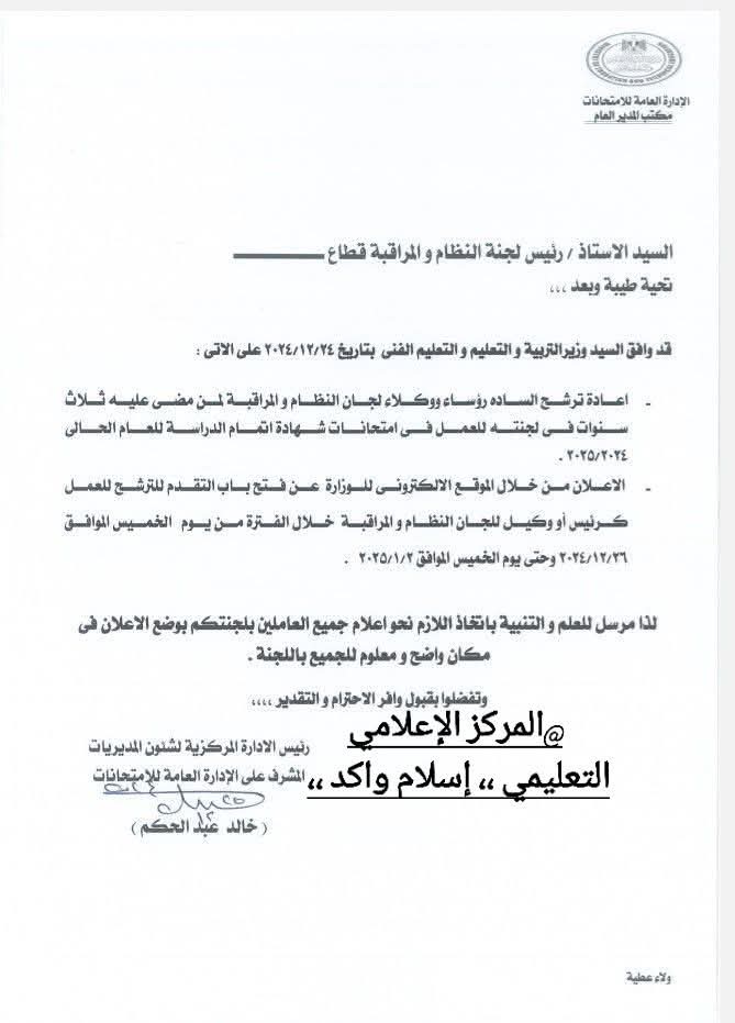 - إعادة ترشح رؤساء ووكلاء لجان النظام والمراقبة لمن مضى عليه ثلاث سنوات في لجنته للعمل فى امتحانات شهادة اتمام الدراسة للعام الحالي ٢٠٢٥/٢٠٢٤