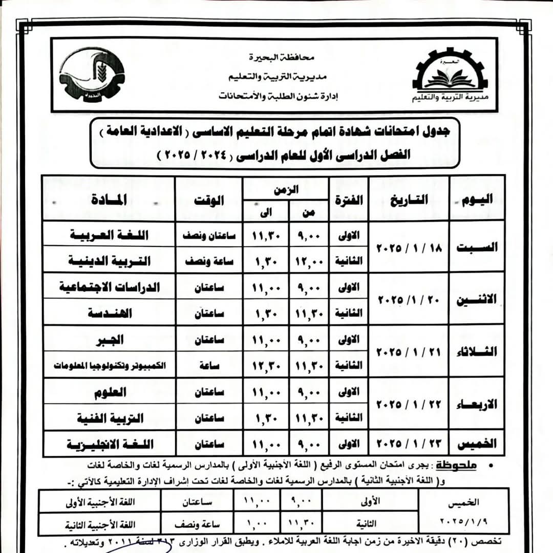 جدول امتحانات الشهادة الإعدادية الترم الأول 2025 بالبحيرة