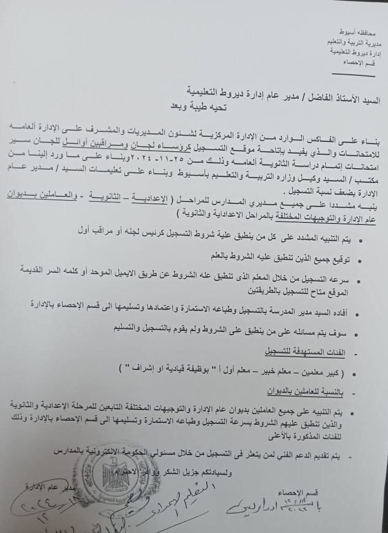 ووجهت الوزارة جميع مديري المدارس للمراحل ( الإعدادية - الثانوية - والعاملين بديوان عام الإدارة والتوجيهات المختلفة بالمراحل الاعداداية والثانوية ) بالتنبيه المشدد على كل من ينطبق علية شروط التسجيل كرئيس لجنه أو مراقب أول