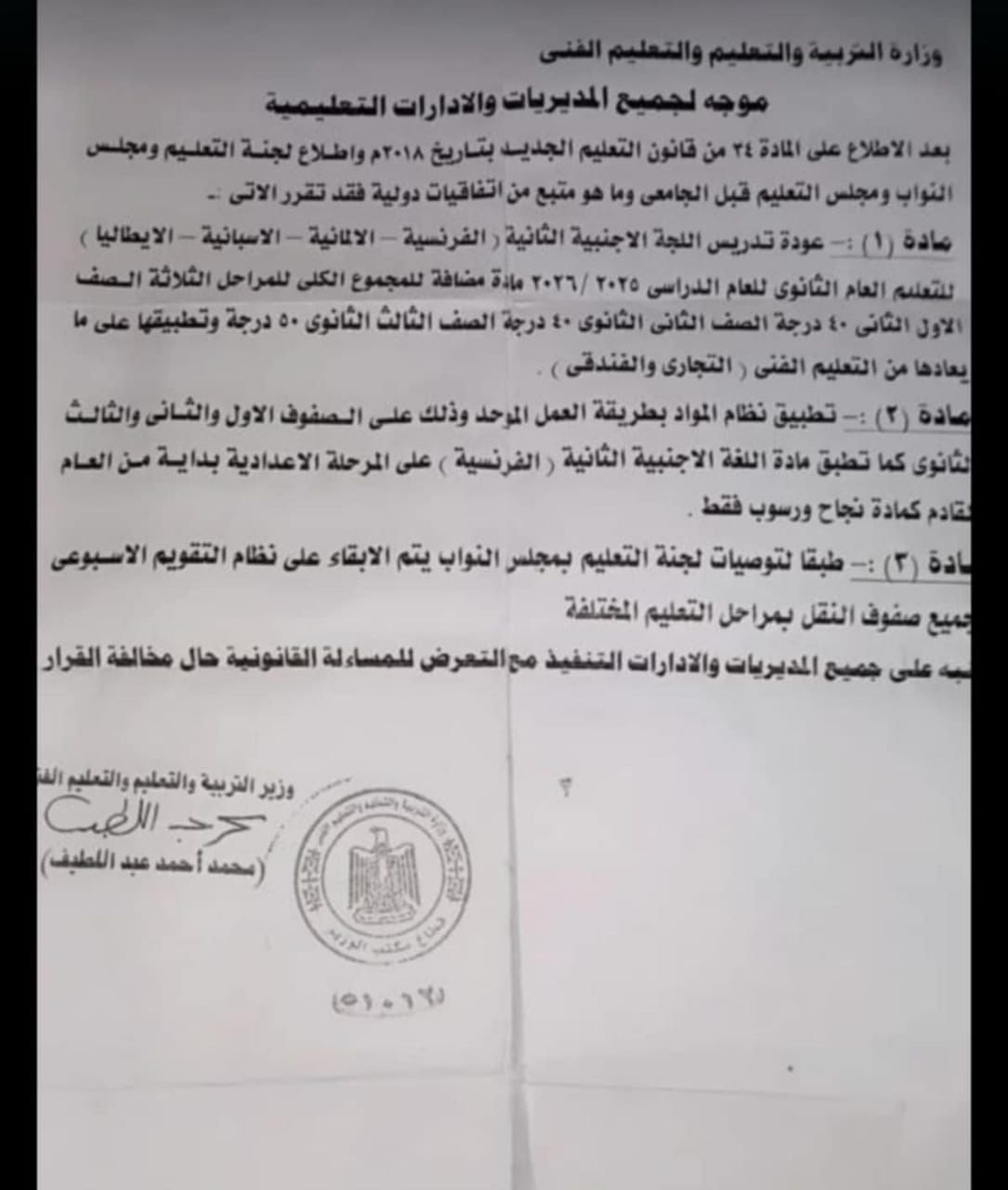 جدير بالذكر أن محمد عبداللطيف وزير التربية والتعليم والتعليم الفني، كان قد أصدر قرارا لإعادة هيكلة المرحلة الثانوية العامة، لتكون اللغة الأجنبية الثانية خارج المجموع.
