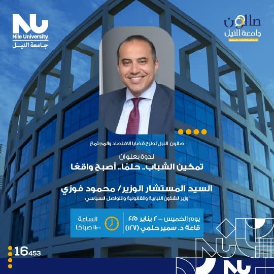 تستضيف جامعة النيل برئاسة الدكتور وائل عقل، غدا الخميس 2 يناير الجاري، المستشار محمود فوزي، وزير الشئون النيابية والقانونية والتواصل السياسي، فى حوار مفتوح مع طلاب وعمداء وأساتذة جامعة النيل، ضمن فاعليات "صالون النيل" المنبثق عن جامعة النيل، وفي إطار سلسلة الندوات التي تتناول عدد من القضايا الحيوية التي تمس المجتمع المصري.