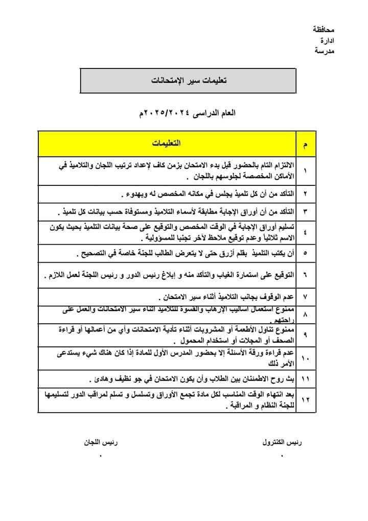- عدم قراءة ورقة الأسئلة إلا بحضور المدرس الأول للمادة إذا كان هناك شيء يستدعى الأمر ذلك