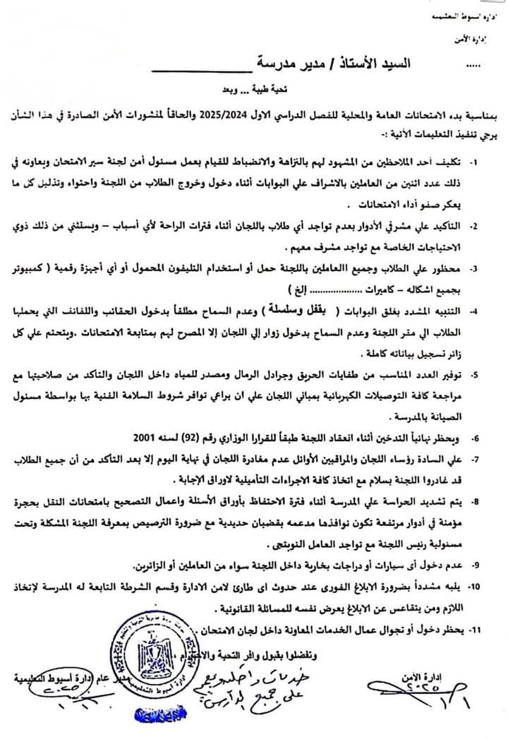 وجهت مديرية التربية والتعليم والتعليم الفني بمحافظة أسيوط، تعليمات مهمة بمناسبة بدء الامتحانات العامة والمحلية للفصل الدراسي الأول 2025/2024.