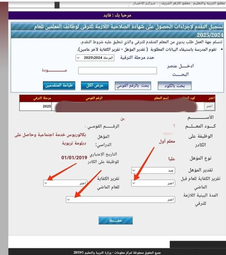 - يسجل للمعلم ثلاث أشياء تقرير الكفاية للعام قبل الماضي وتقرير الكفاية للعام الماضي بالضغط على السهم واختيار درجة التقرير وتسجل ايضا المدة البينية اللازمة للترقي