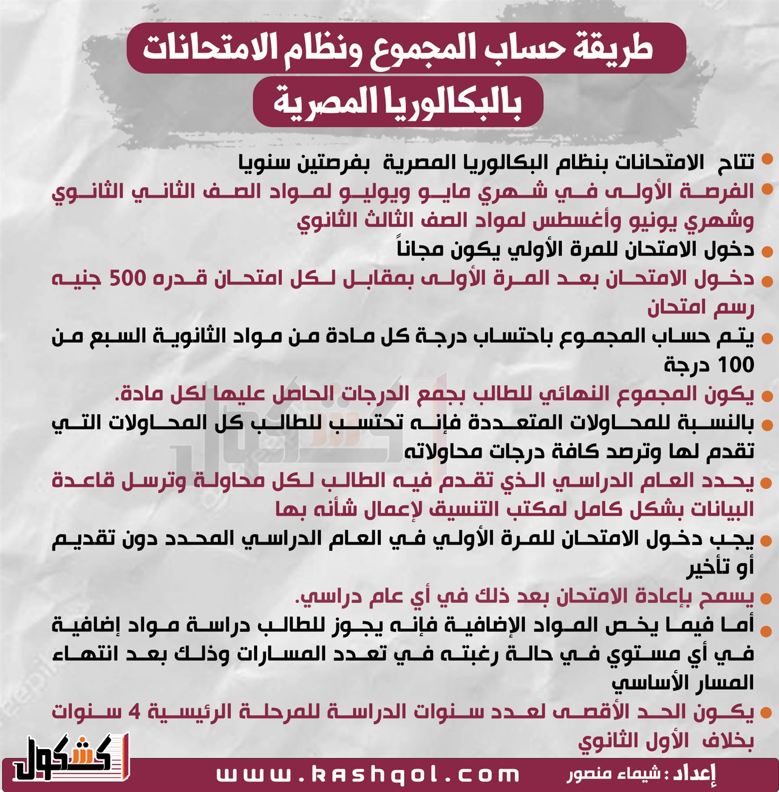 نظام الامتحانات وطريقة حساب بالبكالوريا المصرية «انفوجراف»