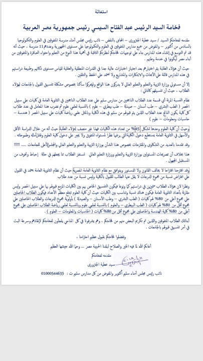 عددهم 11 مدرسة، برسالة استغاثة للرئيس عبدالفتاح السيسي، اعتراضًا على عدم تحديد وزارة