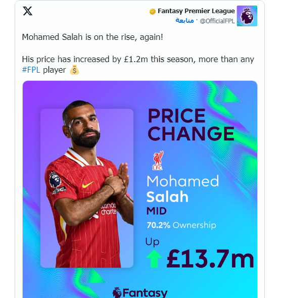 بزيادة قيمته السوقية، أصبح محمد صلاح ثاني أغلى لاعب في فانتازي الدوري الإنجليزي بعد النجم النرويجي أيرلينج هالاند، مهاجم مانشستر سيتي، الذي يتربع على قمة القائمة بقيمة 14.8 مليون جنيه إسترليني، وهذه القيم تعكس التأثير الكبير الذي يحققه كل من صلاح وهالاند في الدوري الإنجليزي، حيث يتنافس كلاهما على صدارة الهدافين.