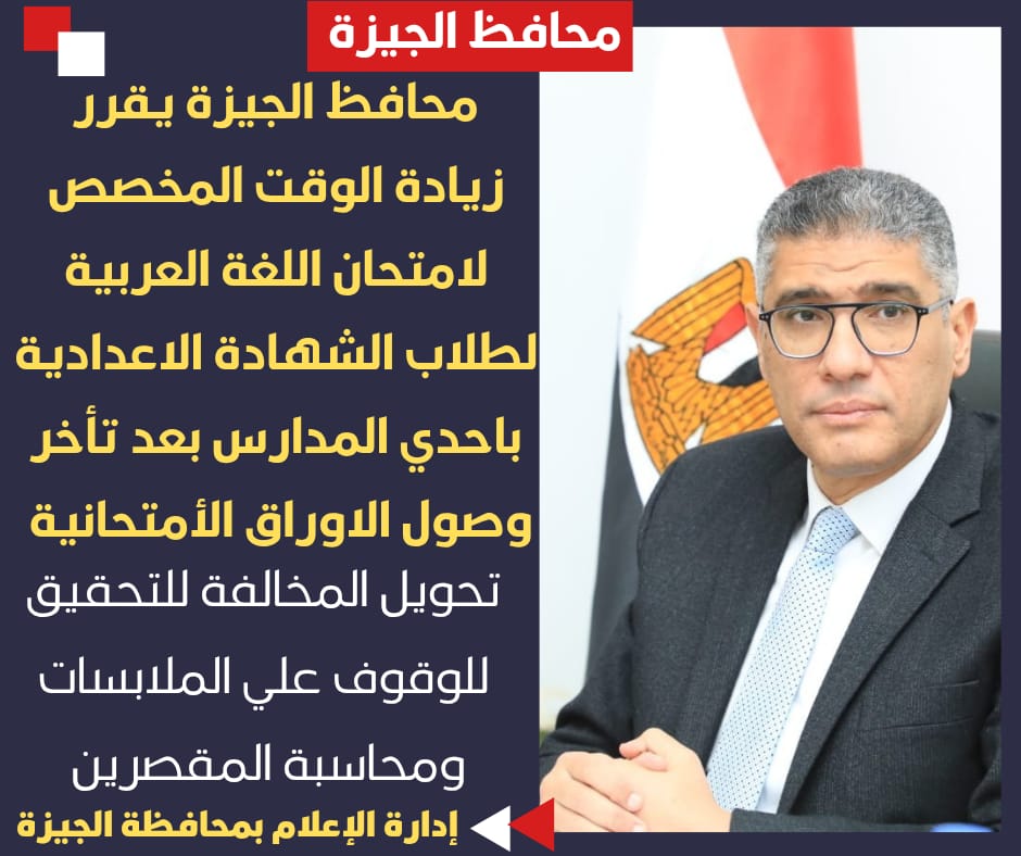 كلف المهندس عادل النجار محافظ الجيزة مدير مديرية التربية والتعليم بتوجيه الإدارة التعليمية المعنية باستيعاض الوقت الضائع من الطلاب انطلاقًا من مبدأ تكافؤ الفرص ولضمان عدم تأثير ذلك على المستقبل التعليمي للطلاب.